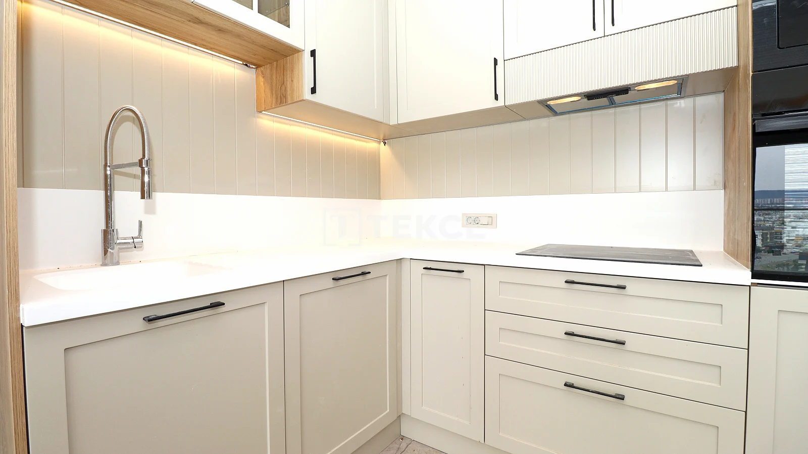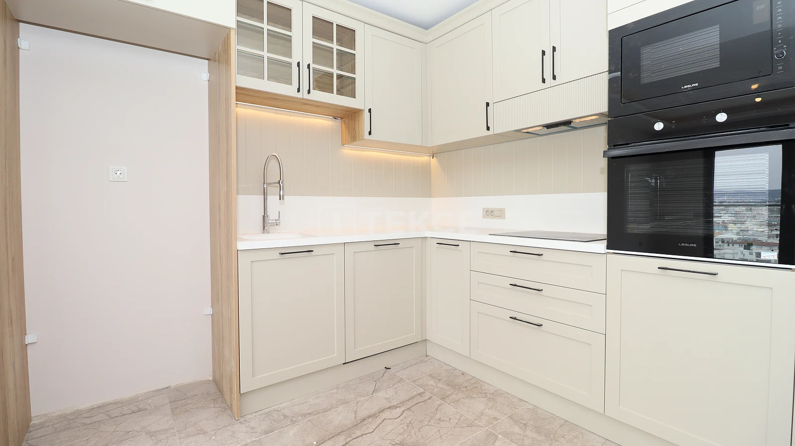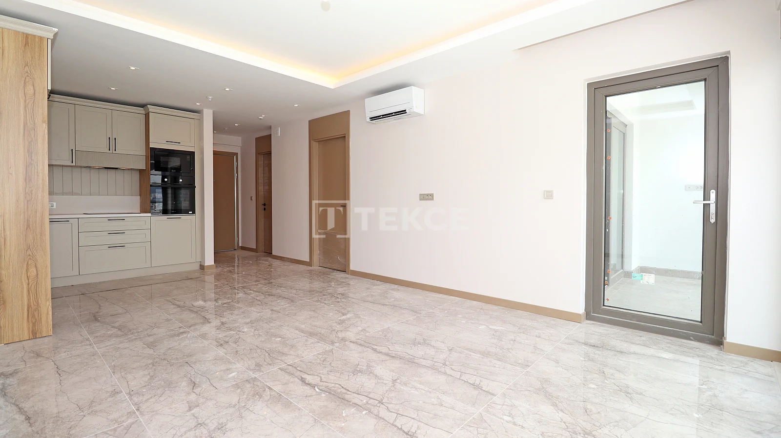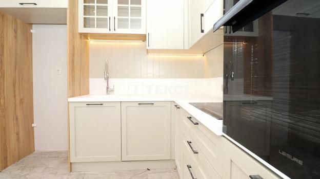 1 bedroom apartment with quality materials and workmanship has a living room, open plan kitchen, bathroom, and balcony. It is equipped with quality materials and workmanship; steel door, Leisure brand dishwasher, built-in oven, microwave oven, built-in oven and range hood, walk-in closet in the bedroom, 2 Mitsubishi Electric brand air conditioners, LED and spot lighting, underfloor heating system, smart home systems, central satellite TV system, cloakroom, electric blinds, high-speed internet infrastructure and shower cabin.