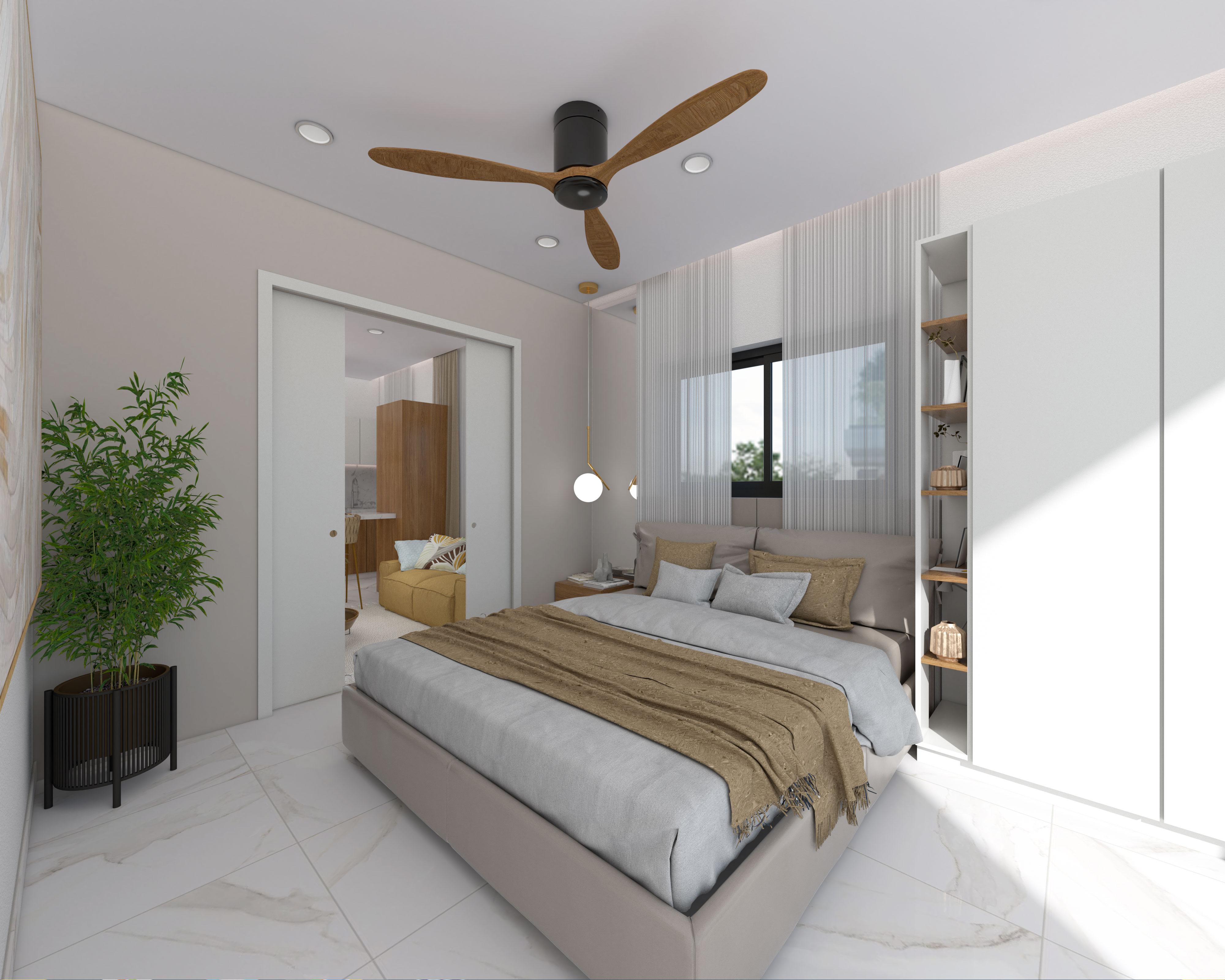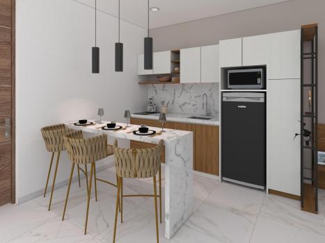 Also, for your convenience, this fantastic condo features a spacious terrace, and it is delivered equipped with air conditioner, ceiling fan, stove, kitchen cabinets made in parotta wood, kitchen bench with stools, microwave oven, fridge, closets, and more!