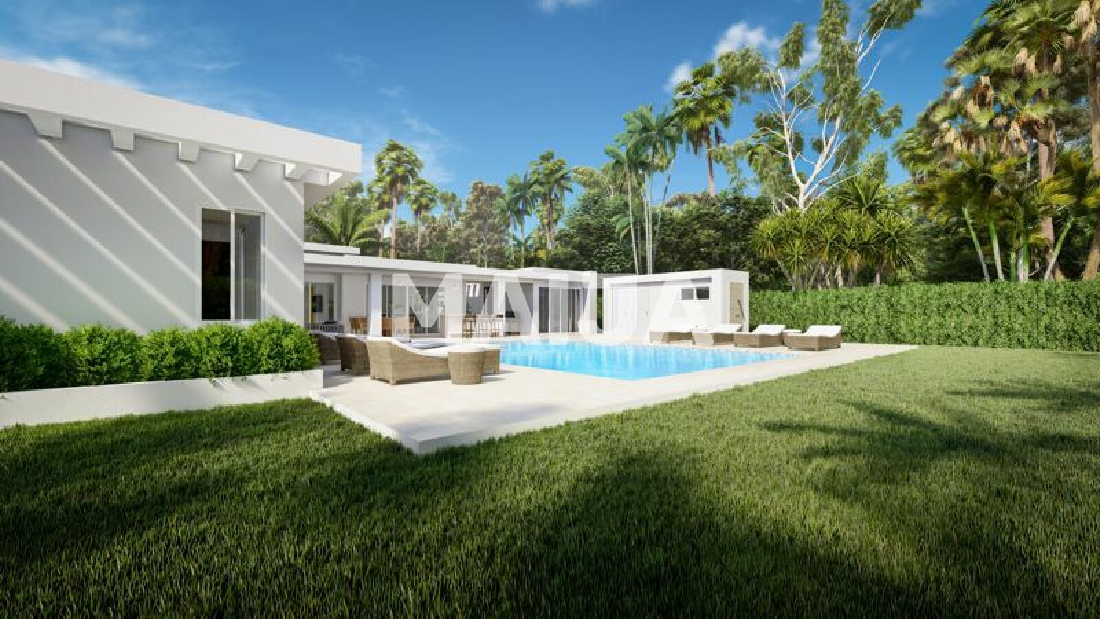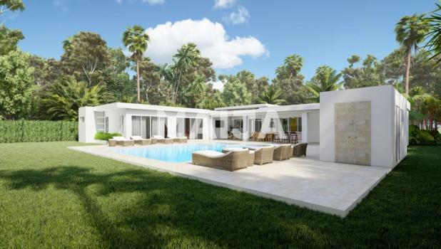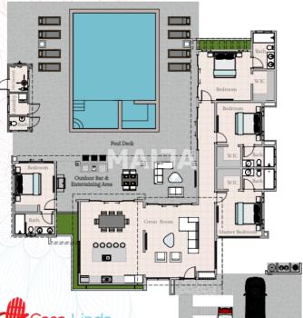 This home offers a Mediterranean style concept of a main home, with two guest houses around a central courtyard and pool. The main villa consists of an open kitchen with generous cabinets and counter space. The dining area includes a breakfast bar and easy access to the outdoor wet bar and BBQ area. The master bedroom offers a retreat-like en-suite and plenty of closet space. The additional guest houses each have a full bath and can accommodate a king size bed. Price includes the lot, villa, landscaping, swimming pool, and service building.