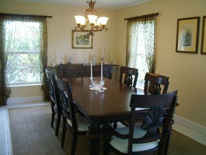 Adjacent to the kitchen is the formal dining room designed for lavish entertaining well designed with elegant wood furniture, brass chandelier and window treatments that compliment the room.