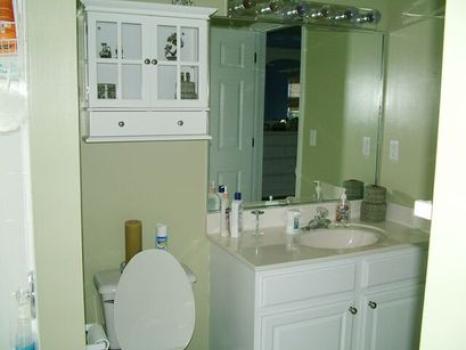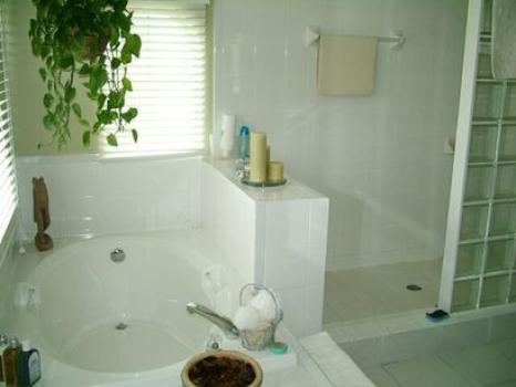 The master bedroom and bathroom are located on the ground floor. The master bathroom features an over-sized bathtub to relax in and a separate shower with ample natural light coming from the windows.