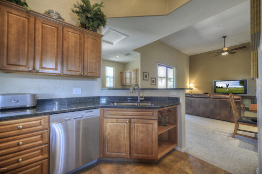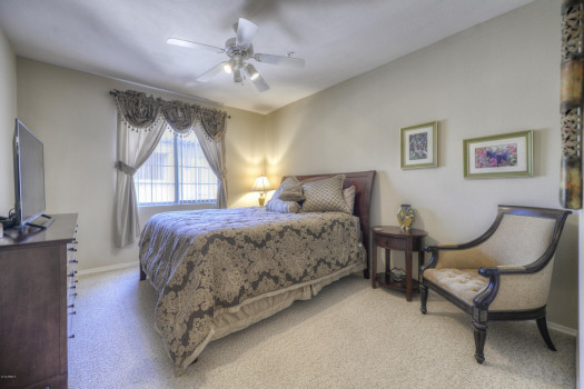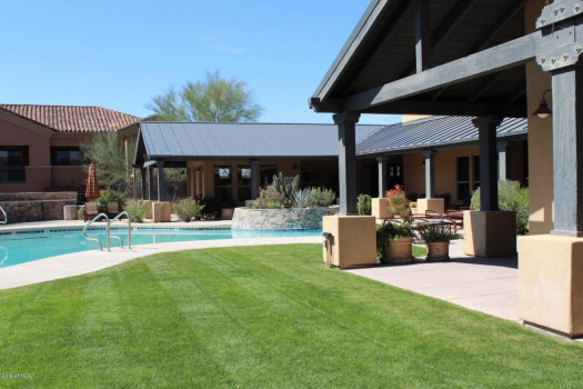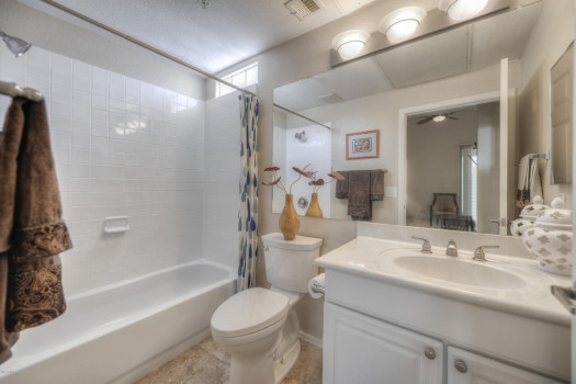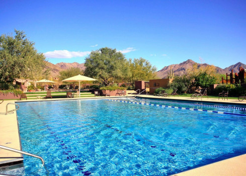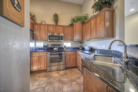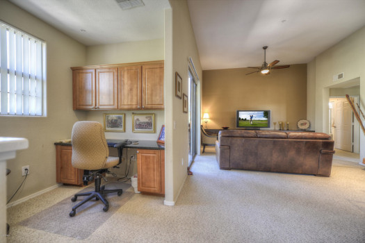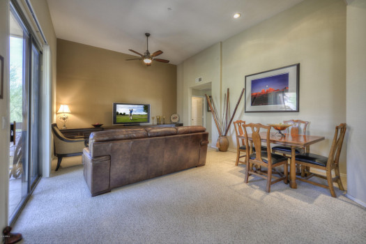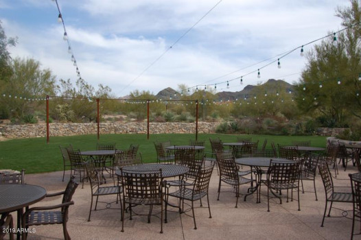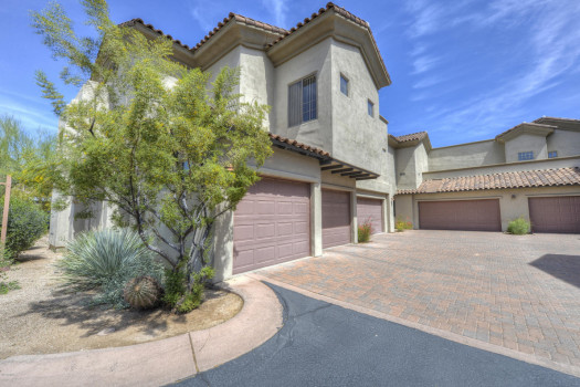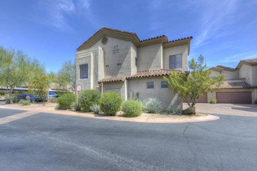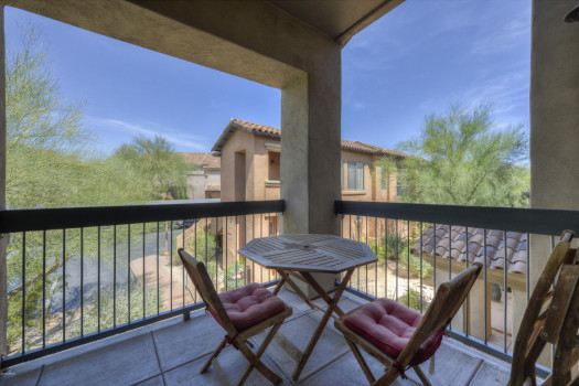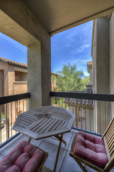 Lowest priced condo with a HUGE 2 car garage in DC Ranch! Lives more like a Twnhme than a condo-no one above or below you! Walking distance to Market Street amenities. Great Rm floor plan that is light & bright w/12 ft ceilings. You'll love relaxing in the large living area w/custom built in credenza. There is also a dining area & separate work/office area. Master suite has a large walk-in closet & spacious bath w/dual sinks. 2nd bedroom is generously sized w/walk-in closet. Relax & enjoy the North facing balcony w/views of the McDowell Mtns. HUGE direct entry 2 car garage that is large enough for 2 full sized vehicles plus motorcycles/bicycles/''toys''! Enjoy DC Ranch lifestyle - fitness center, pools, tennis and numerous walking paths. Furniture is available by separate Bill of Sale.