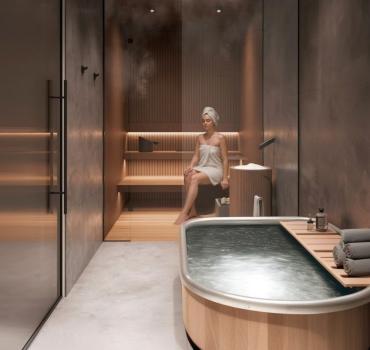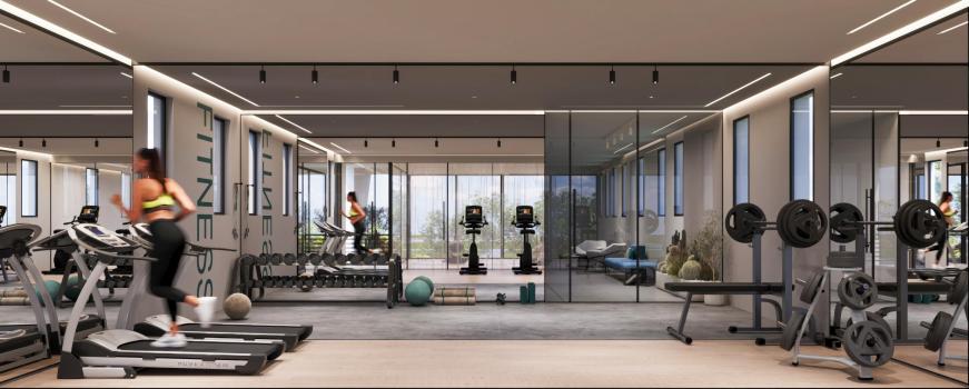 Residents enjoy resort-style amenities including a large swimming pool, fully equipped gym, yoga and wellness areas, sauna, ice bath, café, children’s playground, and walking paths through lush greenery.