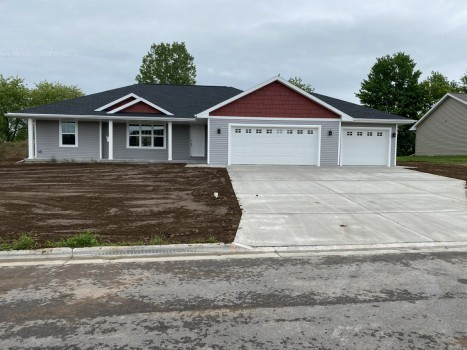 New construction ranch home with large covered front porch! Home offers 1,411 sf with 3 bedrooms and 2 full baths. Features include open concept floor plan, cathedral ceilings, dinette with patio doors, kitchen with custom maple cabinets, island with storage & seating, pantry, SS dishwasher & microwave. Large master bedroom with a walk-in closet and private full bath with walk-in shower. Full basement plumbed for a future bath. Attached 3-stall garage. Home includes passive radon system and a 1-yr home warranty. Virtual staging in photos.