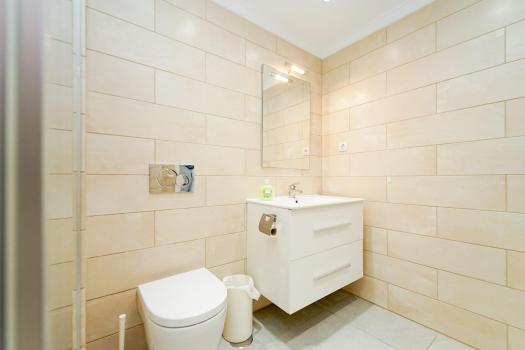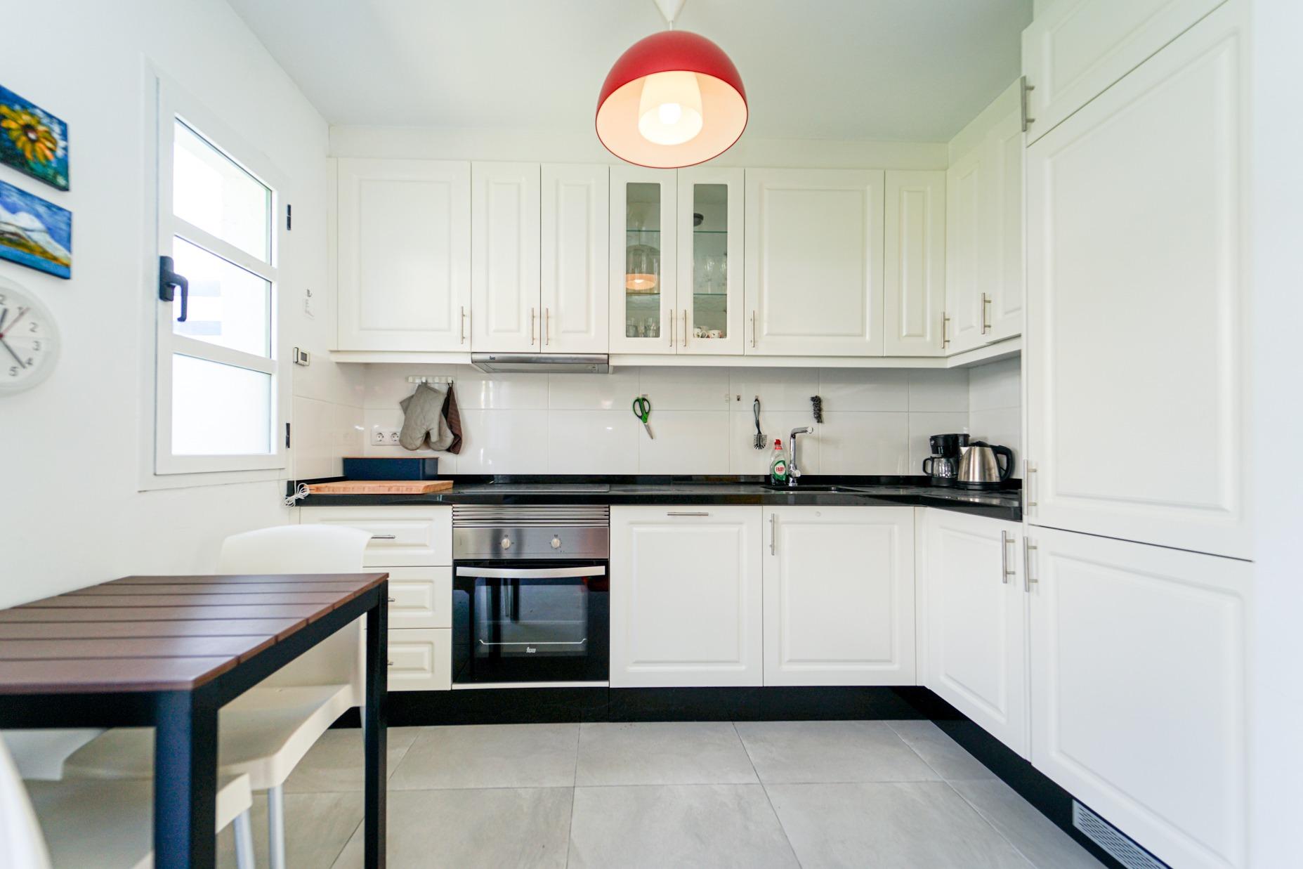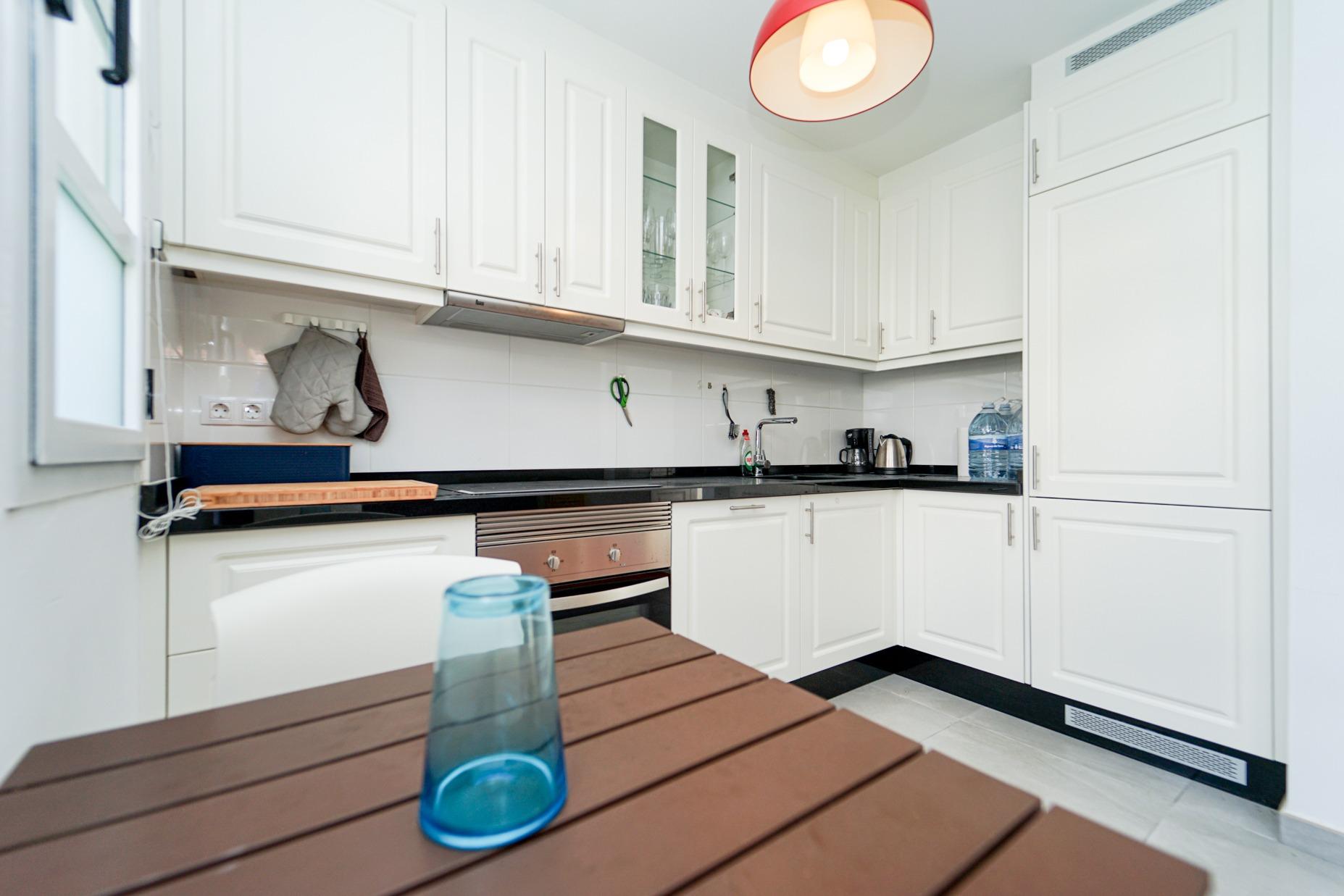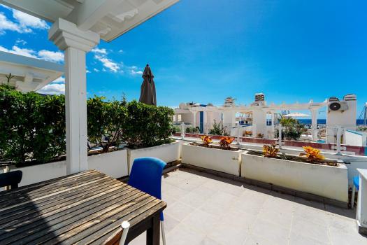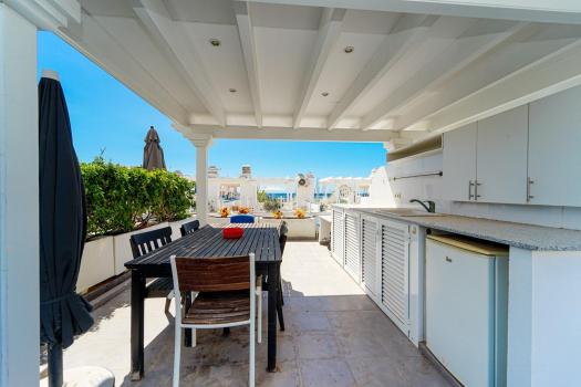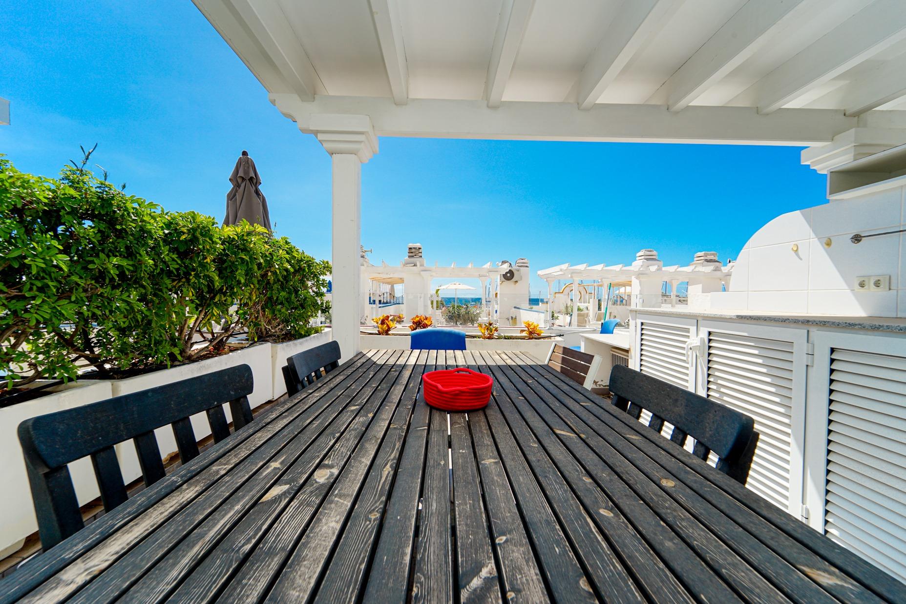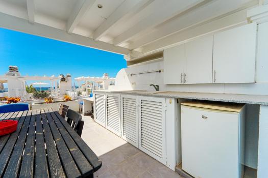 The apartment is sold fully furnished and features a bedroom with ample wardrobe space, as well as a balcony overlooking a lush garden—perfect for enjoying a morning coffee. Its most outstanding feature is the spacious private rooftop terrace with an outdoor kitchen, ideal for al fresco dining while admiring breathtaking sea views.