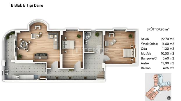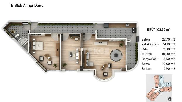 Rising on a total plot of 4,816 m², this exclusive project consists of two blocks and 73 apartments. Responding to all the needs of modern life, the project offers two different apartment types, 2-bedroom and 3-bedroom. The apartments with spacious balconies are designed according to user preference with both open and closed kitchen alternatives. Quality ceramic floor coverings and laminate flooring that combine aesthetics and durability are used in the interiors. Natural gas infrastructure is preferred as the heating system, and a comfortable and quiet living space is provided throughout the four seasons thanks to the under-plaster heat and sound insulation.