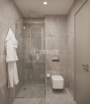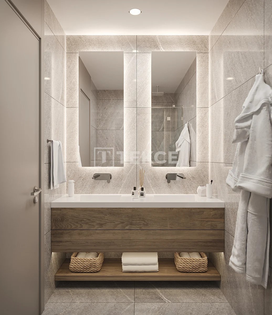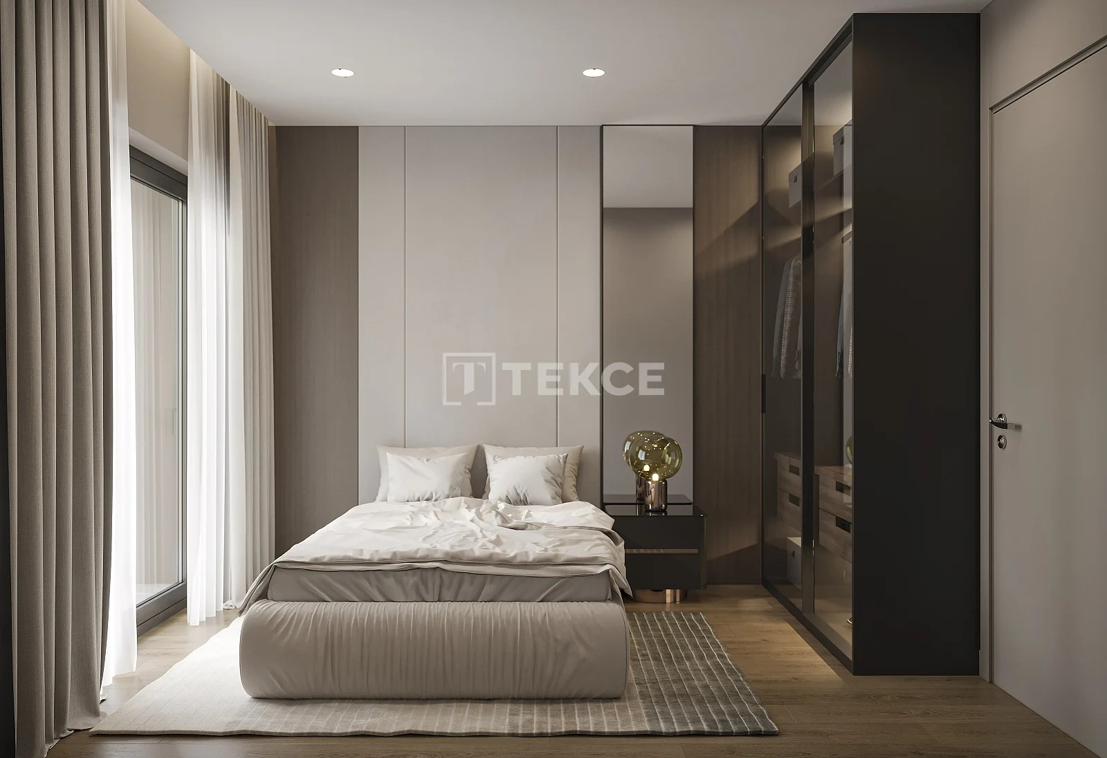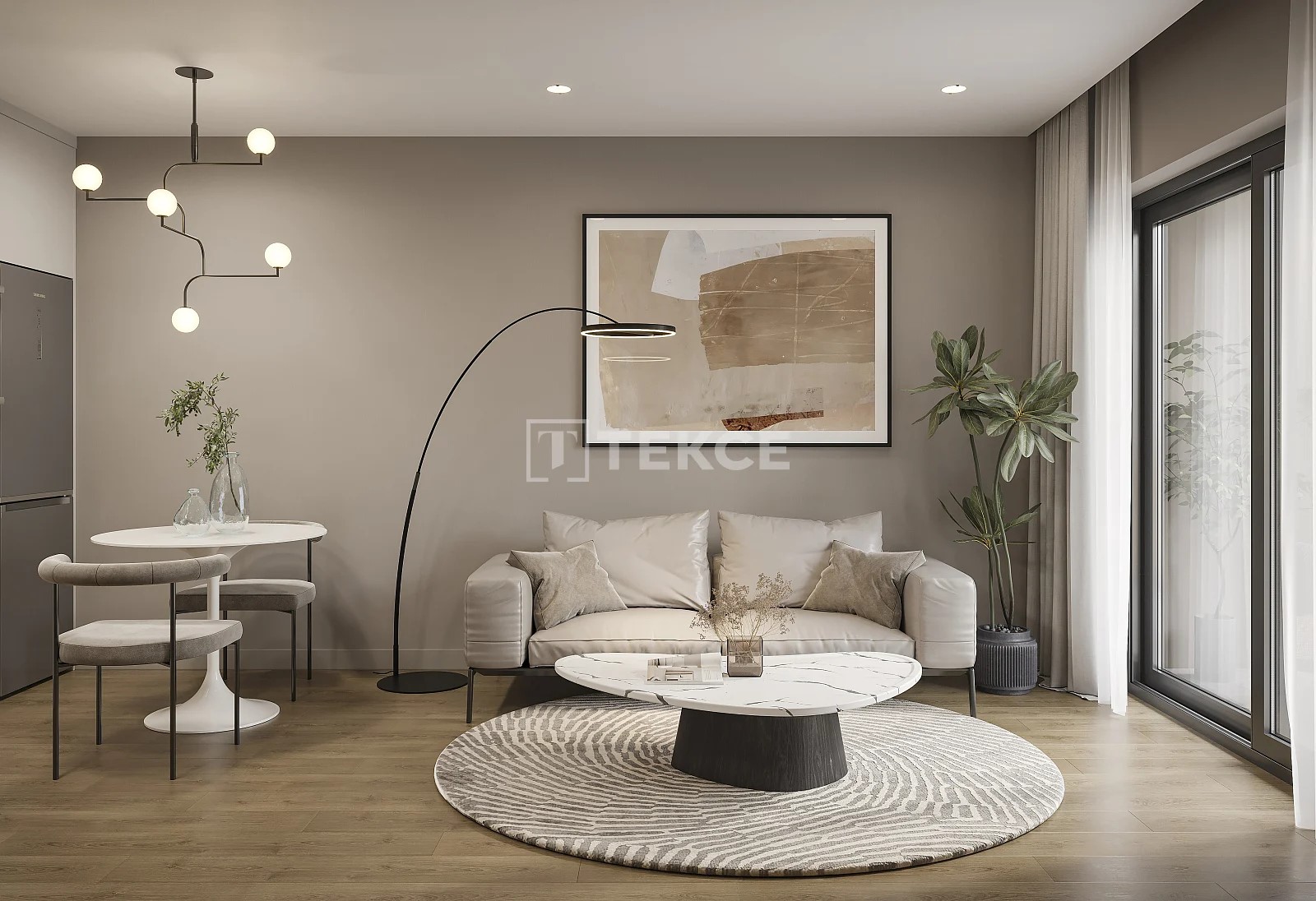 The apartments for sale in İzmir are 150 m from the main street with cafes, 300 m from the sea and the promenade walking road, 500 m from the tram stop, 600 m from Bostanlı market, 1 km from the hospital, 2 km from the open-air theater, 2 km from the shopping center, 2 km from Bostanlı ferry pier, 14 km from İzmir Kordon and Alsancak, and 30 km from Adnan Menderes Airport.