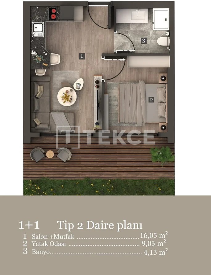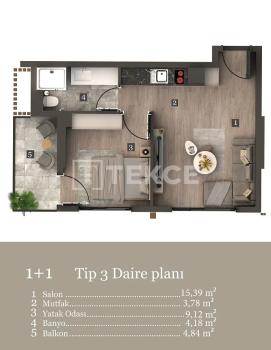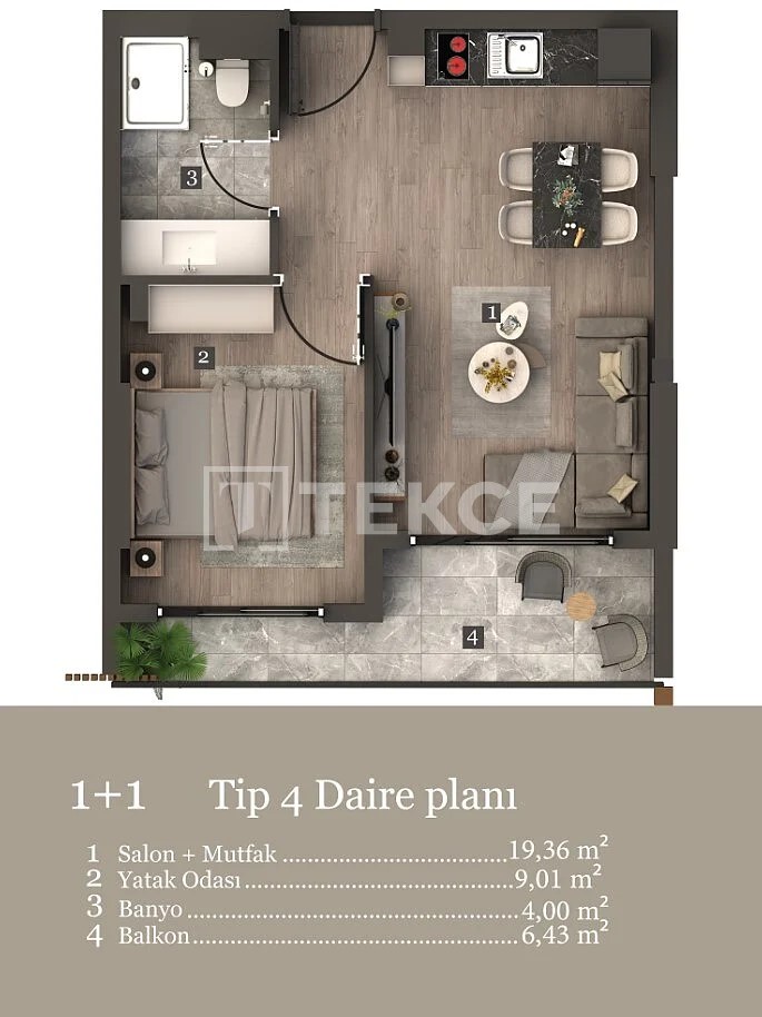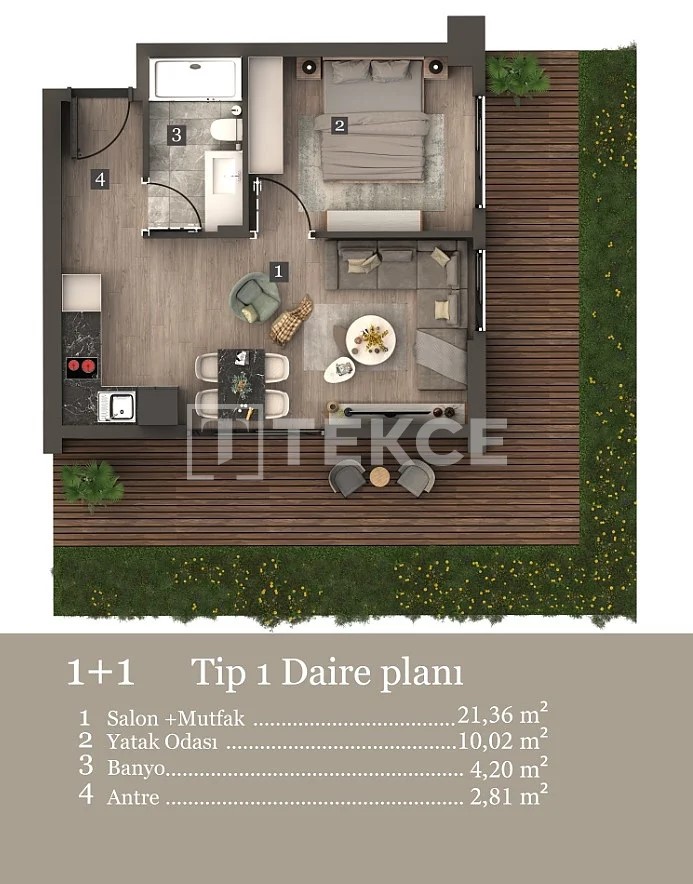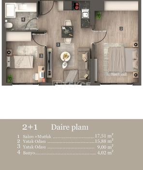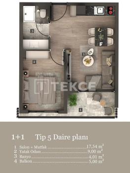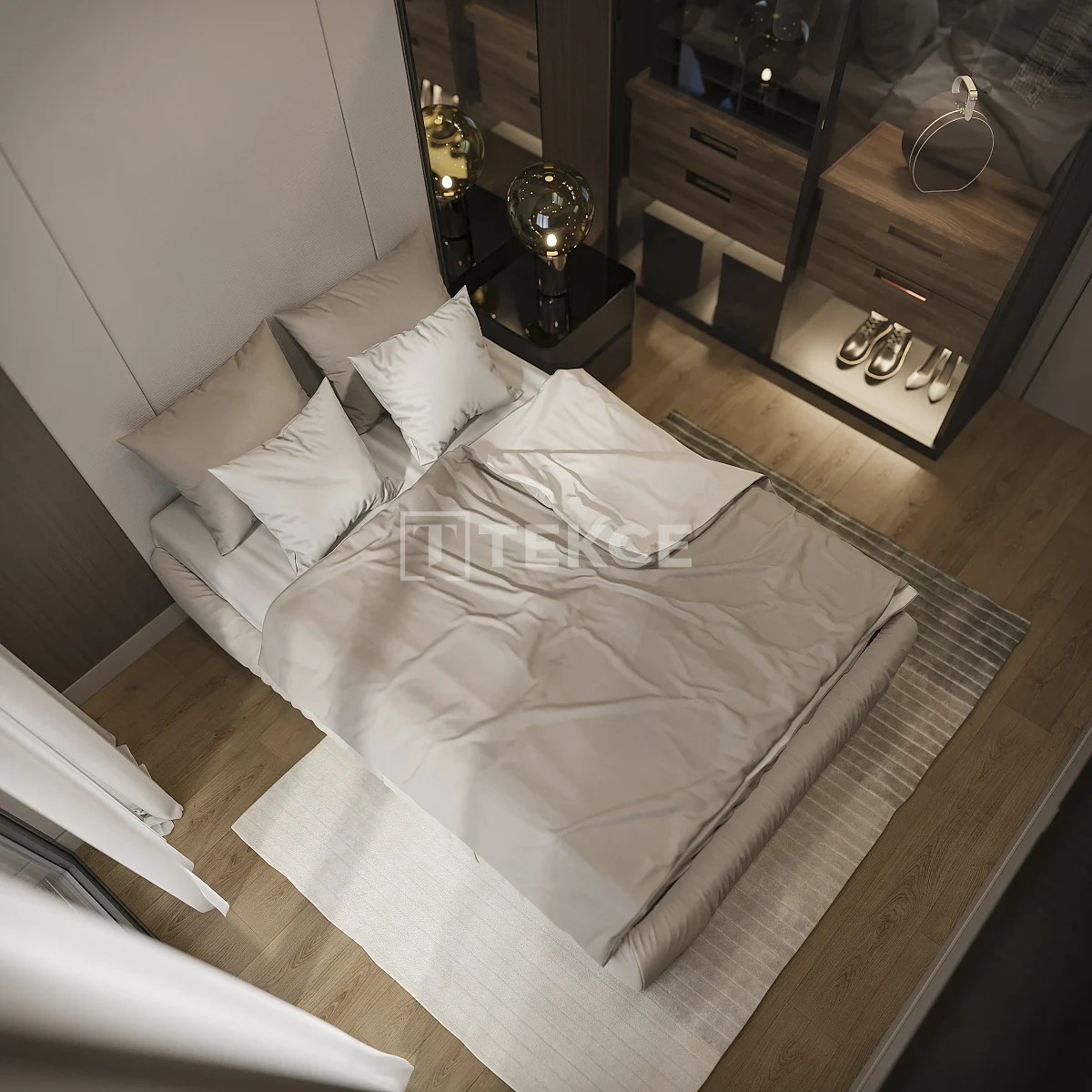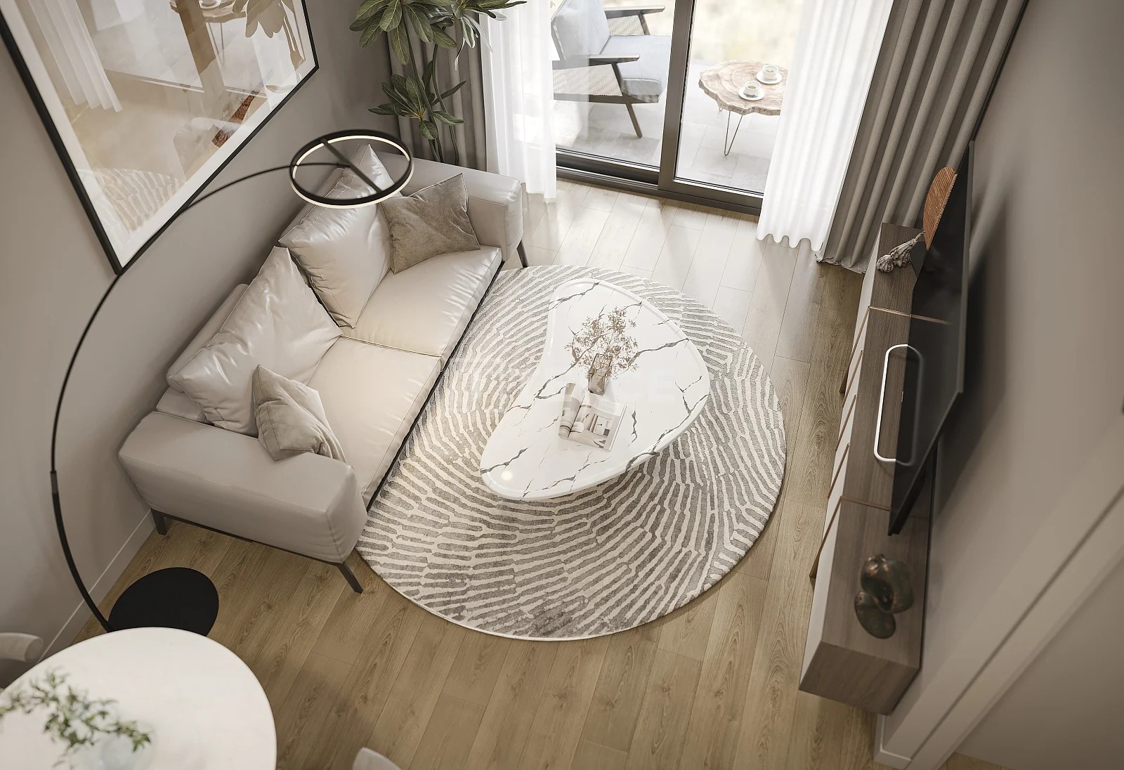 The apartments have a 1-bedroom, an open-plan kitchen, living room, bedroom, balcony, shower cabin, quality branded armatures, a steel door, ceramic and wooden floor coverings, electronic blinds, aluminum window system, natural gas heating system, air conditioning, and quality design kitchen types of equipment.
