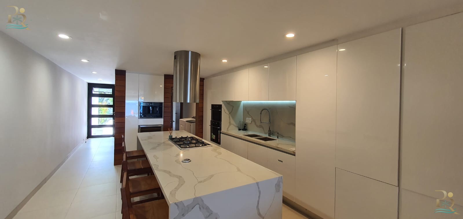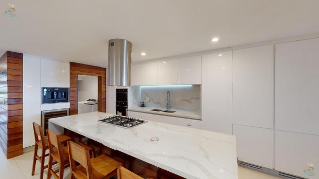 Kitchen: The kitchen is fully equipped with high-end appliances, including a stove, oven, pantry and chest of drawers.