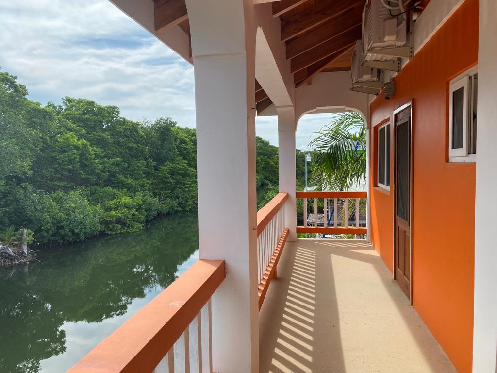Upstairs, you’ll find a 2-bedroom, 1-bathroom apartment. Each bedroom opens up to a verandah with stunning views of the tranquil canal.