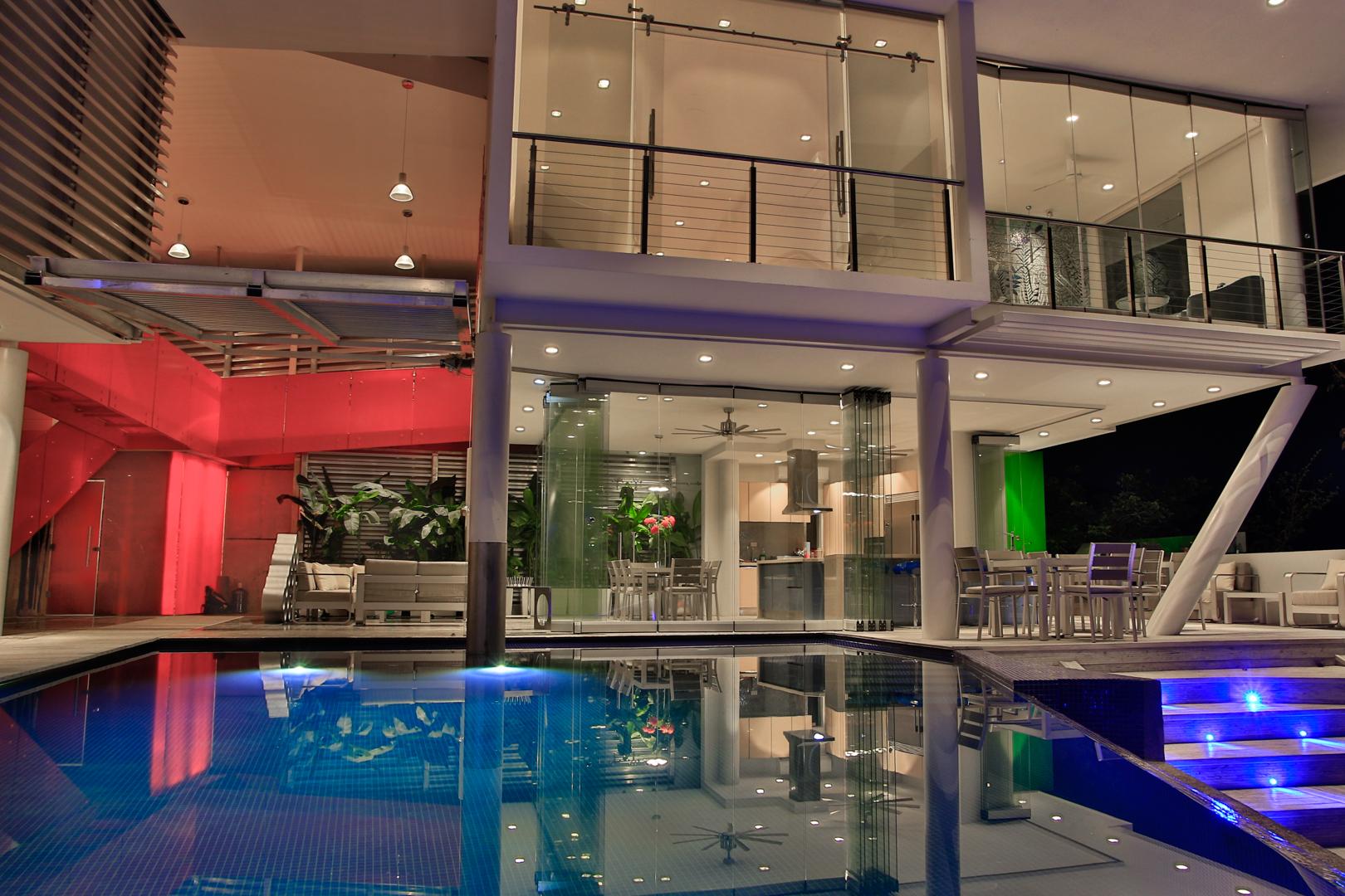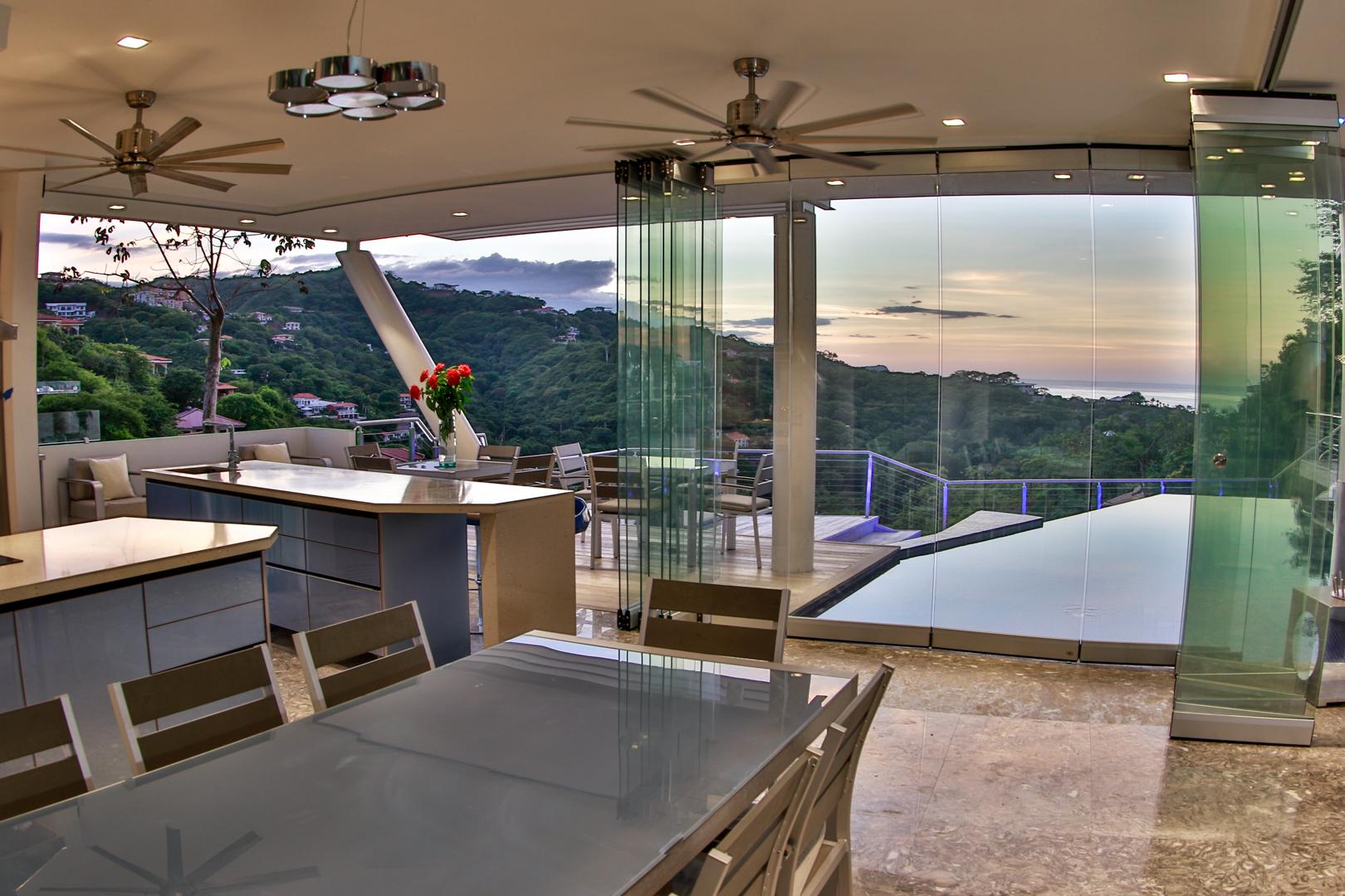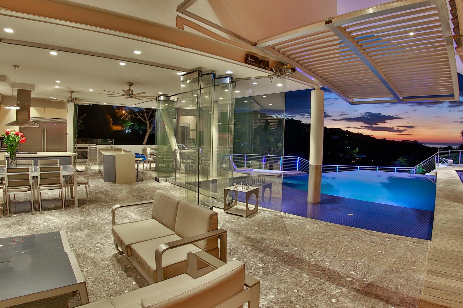 From the moment you enter you will discover an open living space connecting the large kitchen and dining and entertaining areas, surrounded by unique floor to ceiling glass walls that open completely, allowing views in every direction. The kitchen is sleek, stylish and modern, designed to keep up with the gourmet and look amazing. The walls open onto the outdoor living area and the multi-level terraces around the infinity pool with its beautiful teak walkway. Imagine having dinner out here every night and listening to the tropical sounds and the waves.