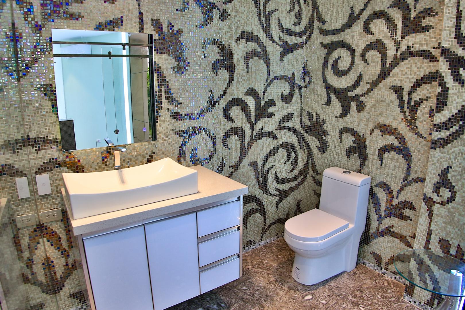 The art deco style orange staircase leads to 4 bedrooms, each with unique mosaic tiled ensuite bathrooms and walls of glass with gorgeous views. Most open onto a private veranda overlooking the terraces, pool and tropical gardens below. The stunning coastal views from the principal bedroom encompass mountain, ocean and the boats in the bay below.