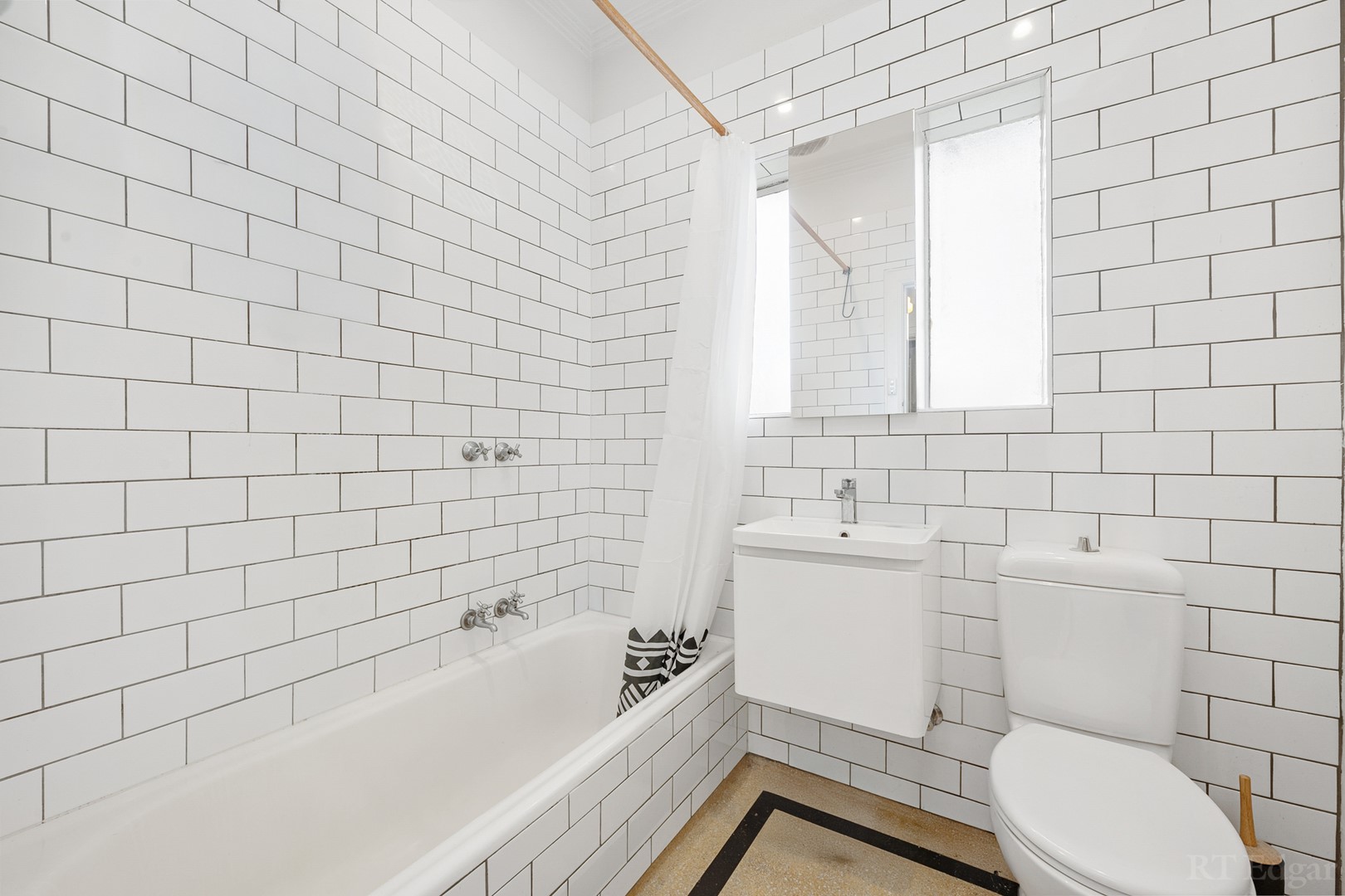 The spacious bathroom showcases classic terrazzo floors and a clean, minimalist design, while the apartment’s high ceilings and original features enhance its period character. Beautiful hardwood floors add to the sense of warmth and sophistication.
