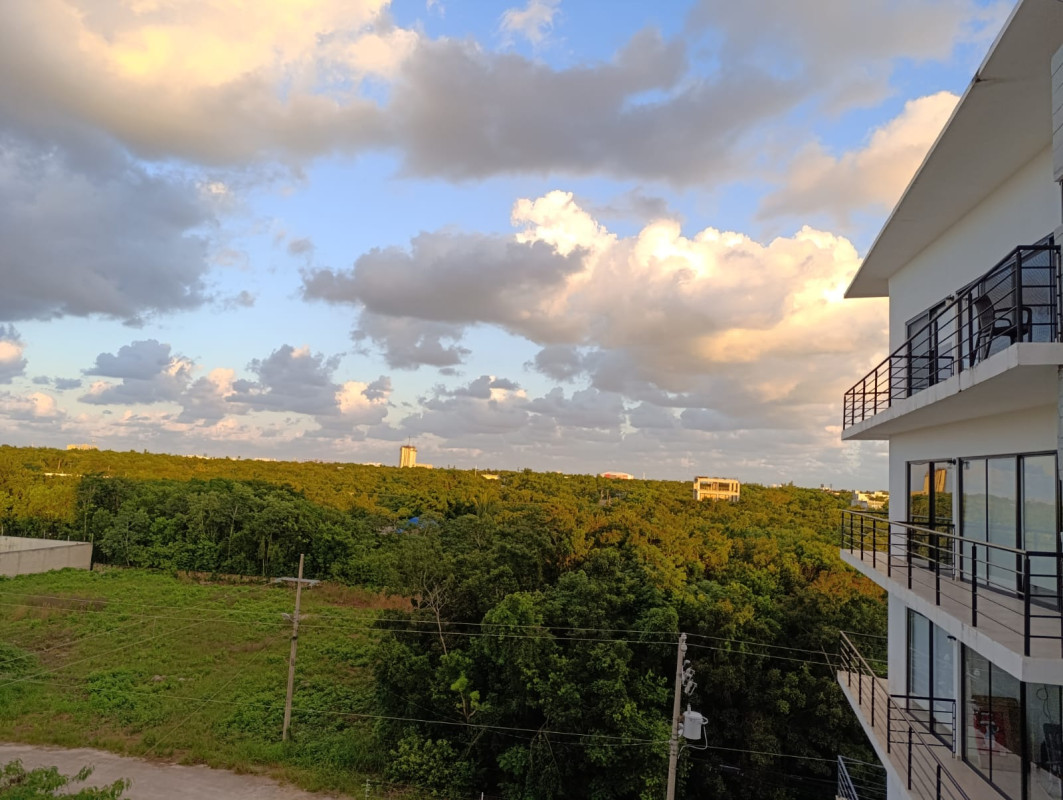 Exclusive development of only 12 apartments distributed in two towers and close to the Cancun International Airport, all while being within a distance to the sea of 20 minutes. All necessary services are within walking distance of the unit. Apartment is located on the 4th floor, giving a view of the hotel zone (not the sea). Interior Distribution: spacious room with terrace and view of the pool.