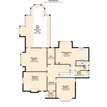 Ground Floor: Covered Porch, Hallway, Downstairs WC / Cloaks, Reception Rooms 1, 2 & 3, Sun Room with Swimming Pool, Kitchen / Dining Room, Rear Hall and Utility Room.