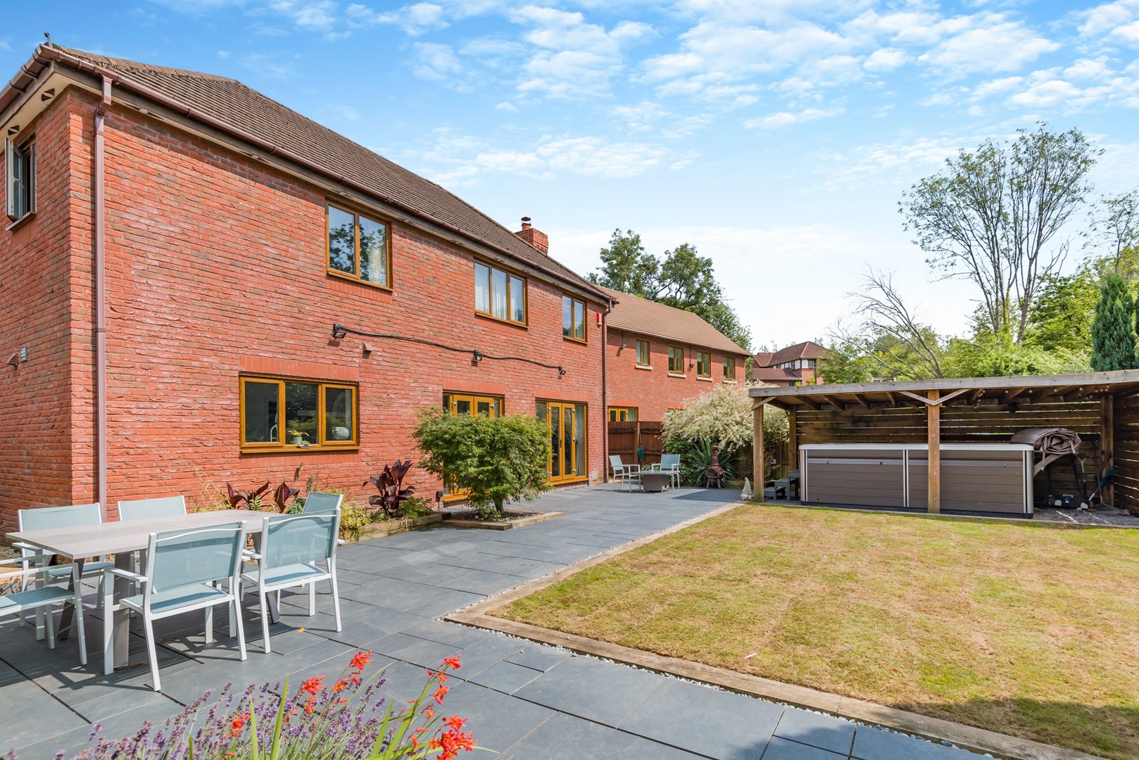 The property has lots of kerb appeal, built in a mid-century architectural style with a number of period-influenced features including leaded bay windows and a gable end faced with decorative tiling. A brick paved front driveway provides off-road parking for two vehicles in front of an integral double garage. The level, landscaped rear gardens comprise a large paved area for outdoor relaxing and entertaining, a recently re-turfed natural lawn and a dark wood pergola housing a swim spa hot tub and an ornamental water feature.