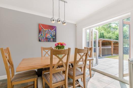 The heart of this family home is the spacious, open plan kitchen/dining room, which is located at the rear of the property, overlooking the well-maintained, enclosed gardens. The sleek, contemporary-style kitchen has been recently fitted with attractive grey high gloss units and incorporates a selection of integrated appliances, whilst there is also ample space for a freestanding fridge freezer. A large central island doubles up as a breakfast bar. Off the kitchen there is a useful utility room with space and plumbing for a washing machine and tumble dryer.