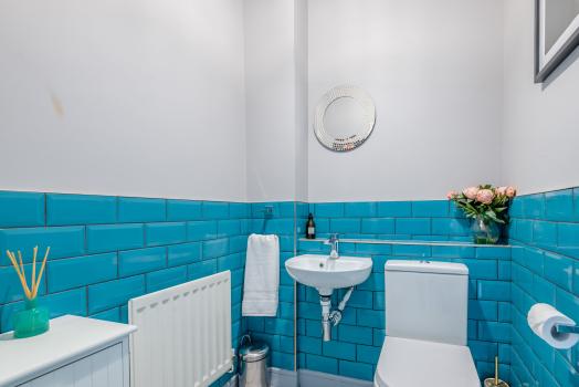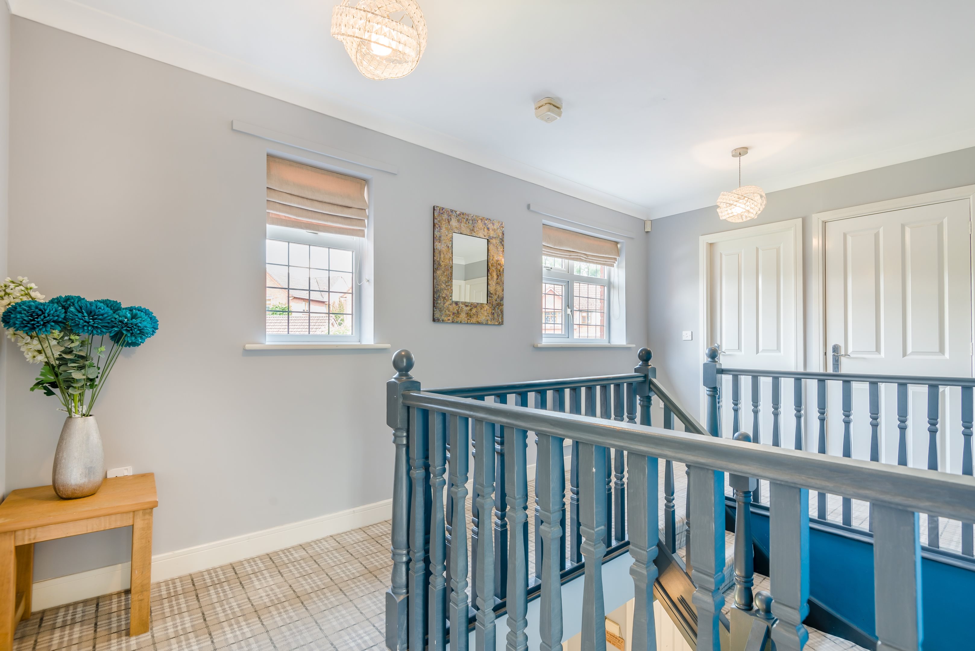 Step inside - From the front driveway, a path leads down the side of the garage to the front door, inset under an arched open fronted porch. The door opens to a hallway, with a wooden floor and doors leading off to the main ground floor rooms and to a downstairs cloakroom, finished in striking green Metro tiles. A staircase rises to the first floor and there is a useful under stairs storage cupboard.
