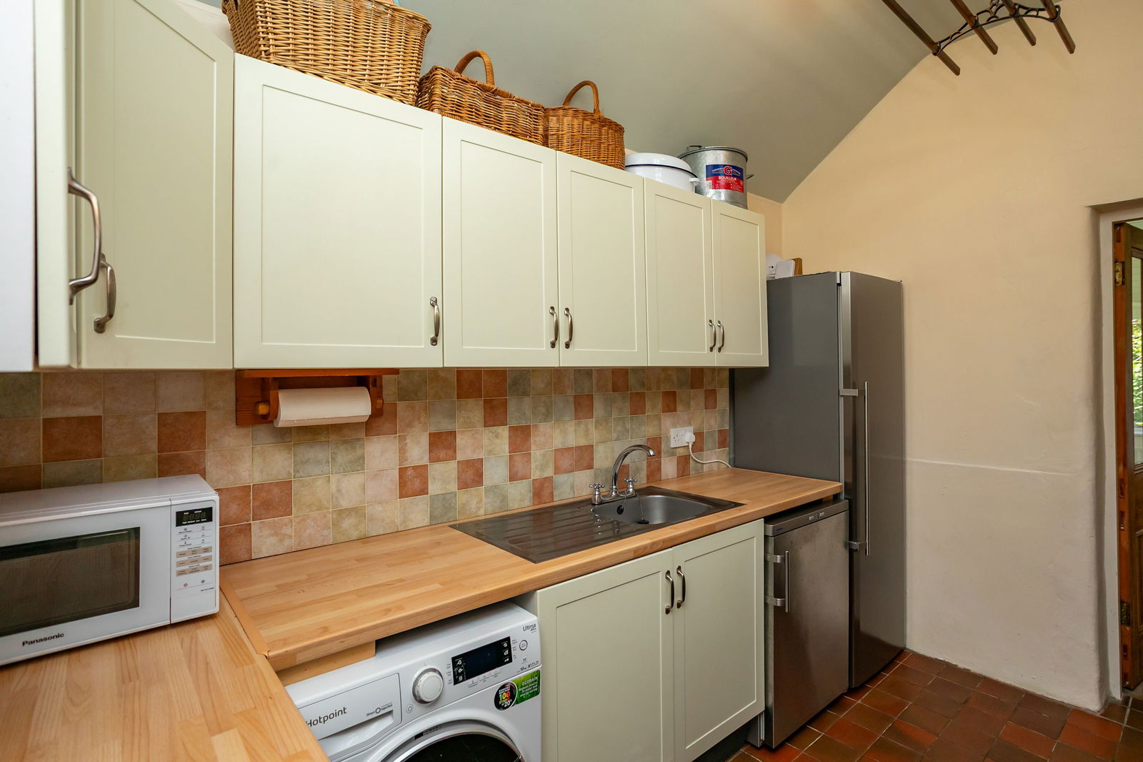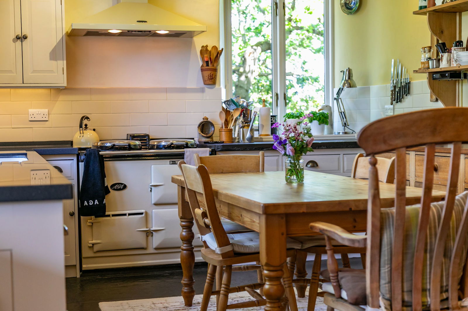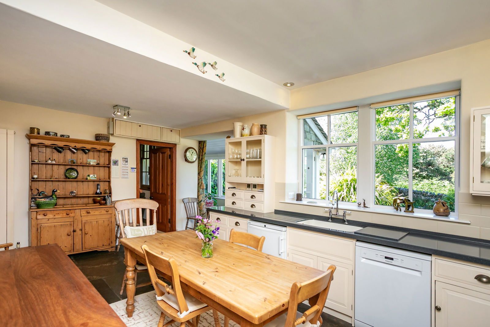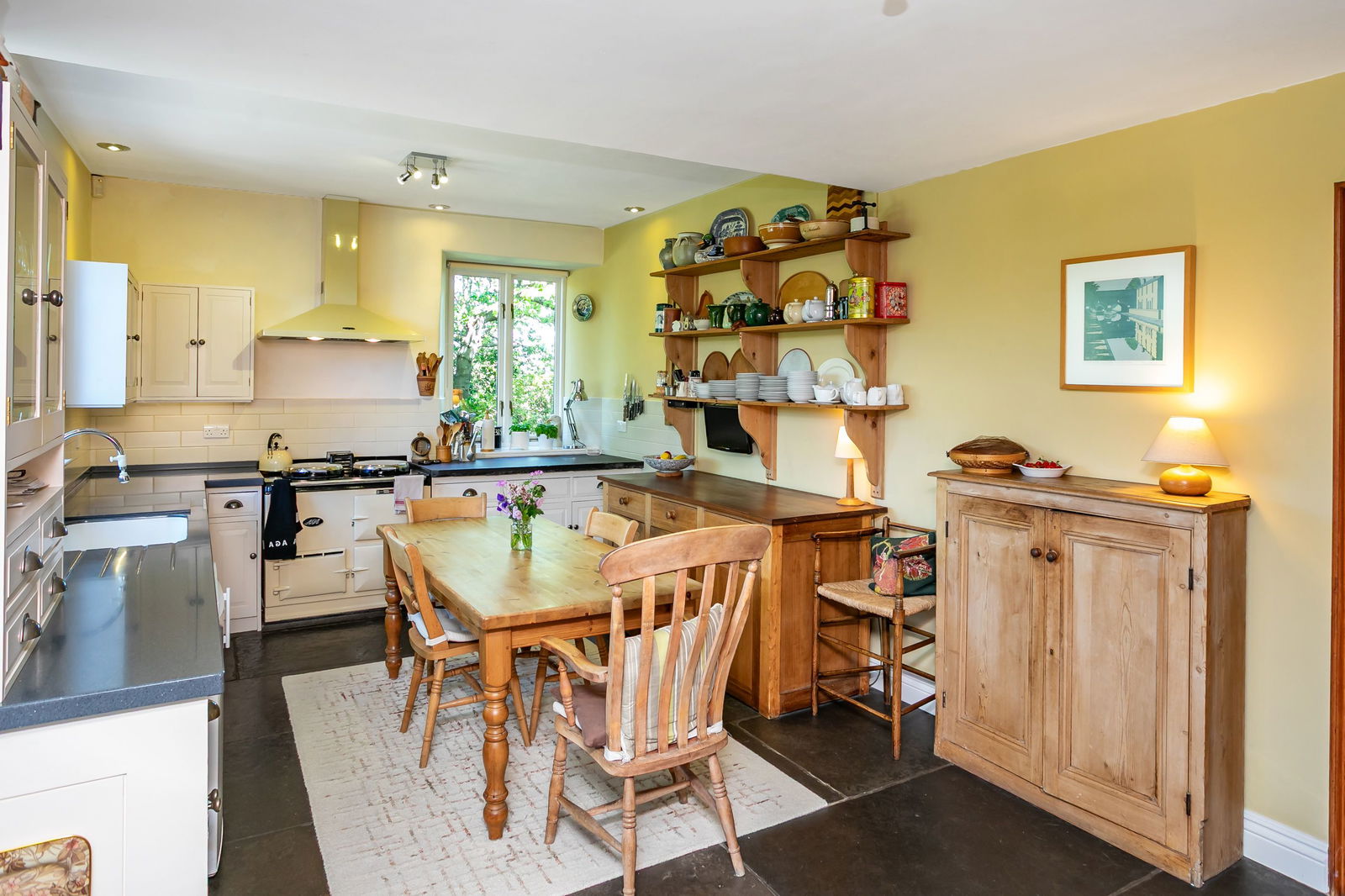 - Modern porch entrance with traditional Lakeland slates into a large working family kitchen with solid wood cabinets and freestanding dresser, original slate worktop and a programmable electric aga. Views to the Old Man of Coniston and Black Combe.