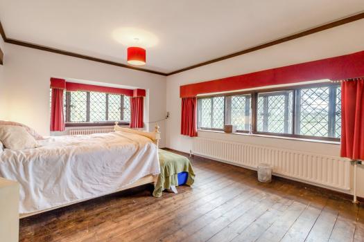 The ground floor of the property features an array of elegant, spacious rooms perfect for both family life and entertaining. Two distinguished dining rooms, with their rich wood paneling and statement fireplaces, offer exceptional settings for hosting guests. Large bay windows frame the views over the expansive lawn and surrounding woodlands. The kitchen is both practical and spacious, complete with modern appliances, while the downstairs bathroom adds to the convenience of this floor.