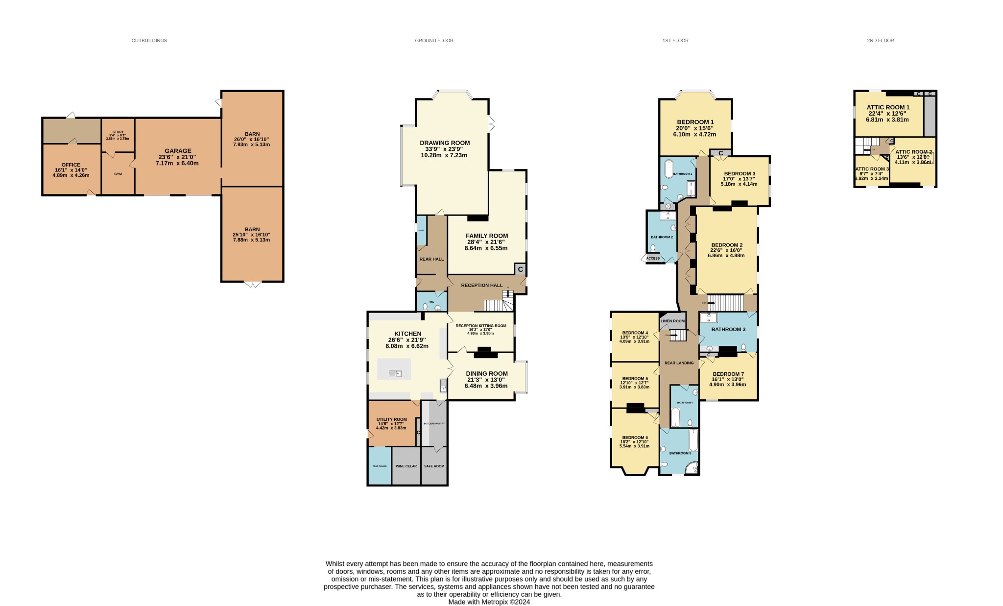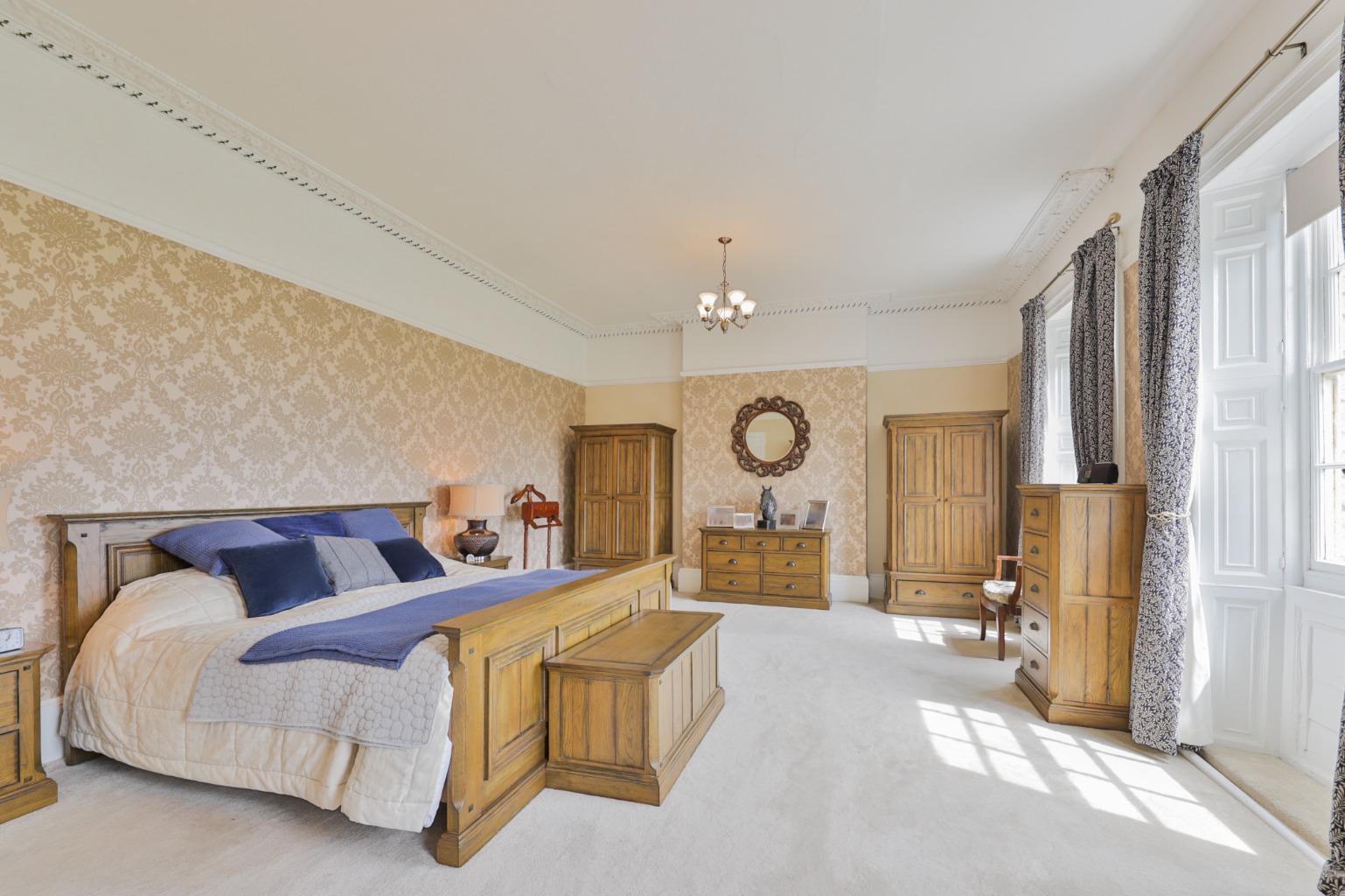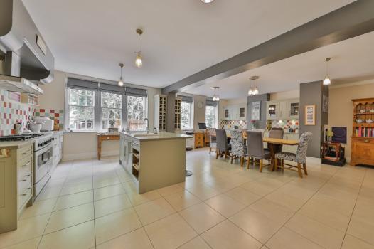 The property offers expansive living space, with approximately 7500 sq ft of accommodation. The interior is both spacious and elegant, featuring seven well-proportioned bedrooms, five modern bathrooms, and five grand reception rooms. Each room has been thoughtfully designed to combine period features with contemporary comforts. The high ceilings and original panelled dining room add a touch of historical authenticity, while the overall presentation ensures it is in move-in condition.