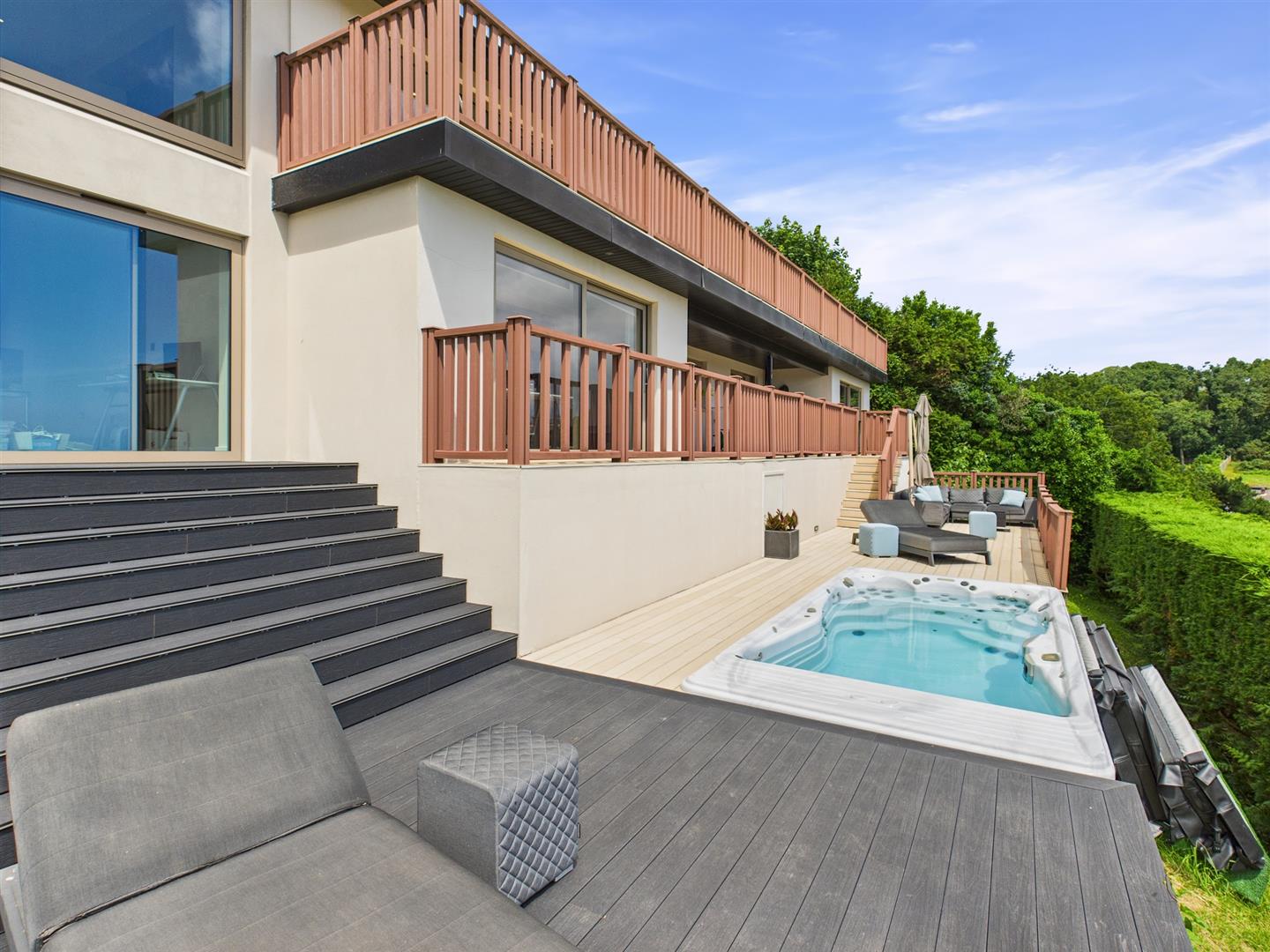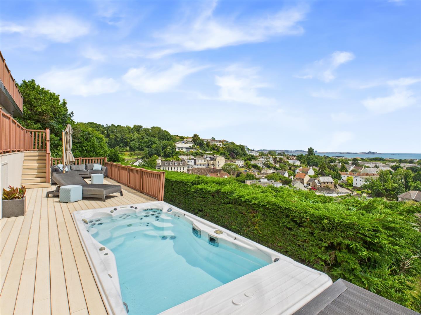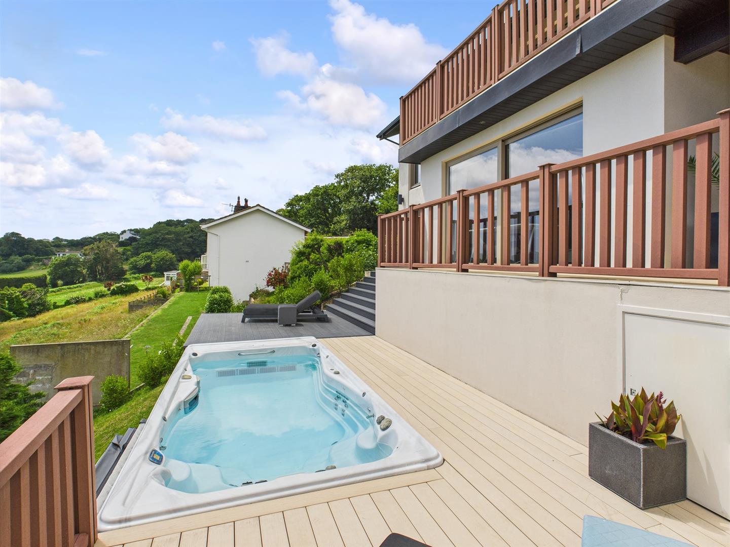 Decked areas create the perfect setting for alfresco dining, morning coffee, or simply soaking in the breathtaking views. For added indulgence, a “Michael Phelps” hot tub offers the ultimate space to relax while taking in the scenery. The landscaped gardens have been reimagined with low-maintenance planting, including ivy and carefully selected shrubs, providing year-round greenery with minimal upkeep.