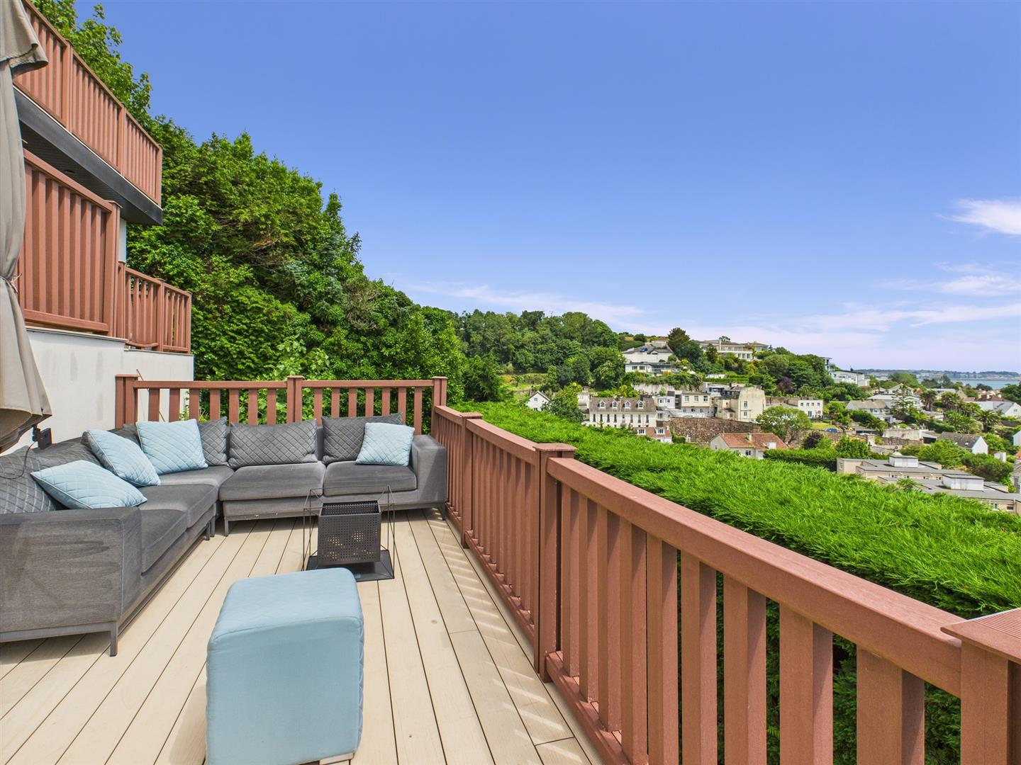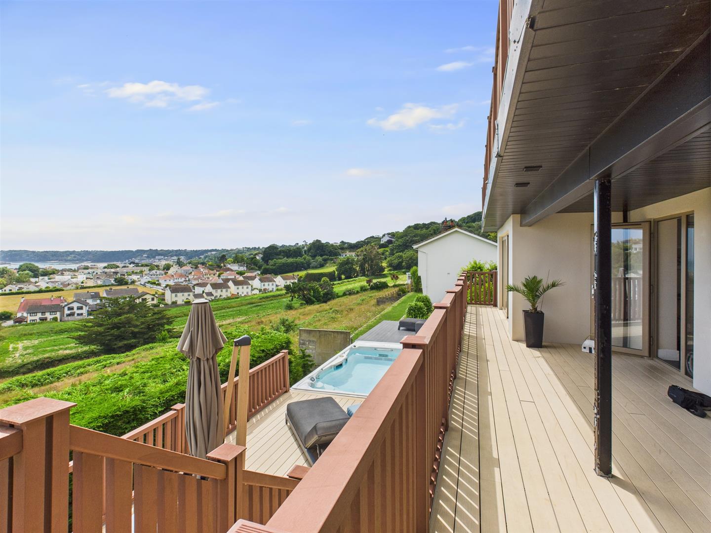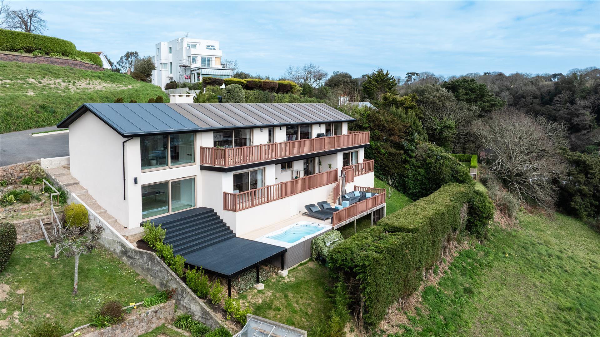 Decked areas create the perfect setting for alfresco dining, morning coffee, or simply soaking in the breathtaking views. For added indulgence, a “Michael Phelps” hot tub offers the ultimate space to relax while taking in the scenery. The landscaped gardens have been reimagined with low-maintenance planting, including ivy and carefully selected shrubs, providing year-round greenery with minimal upkeep.