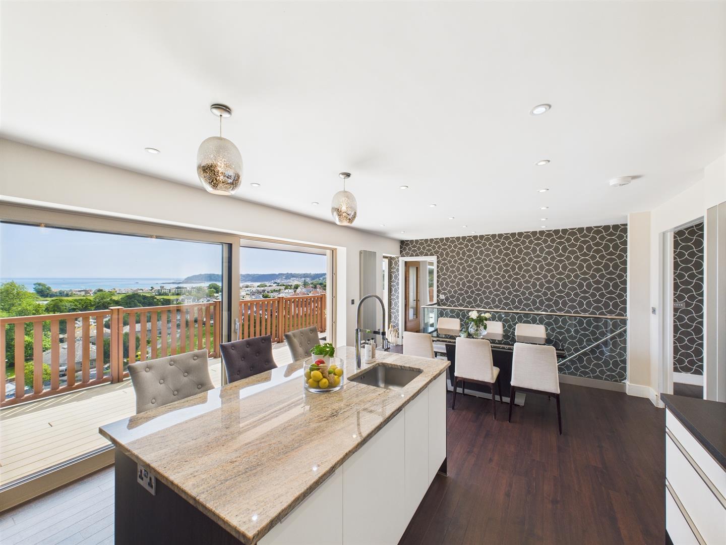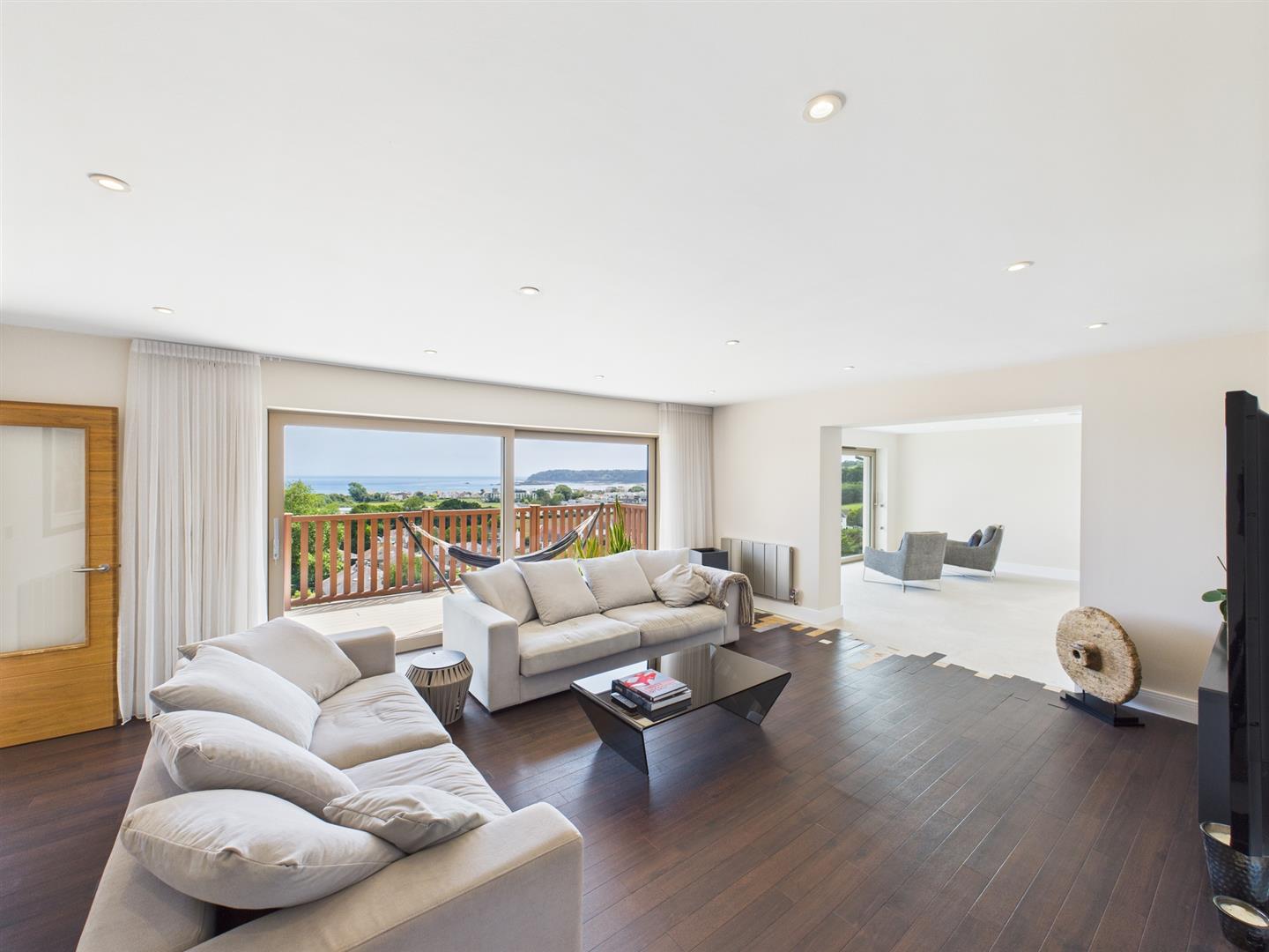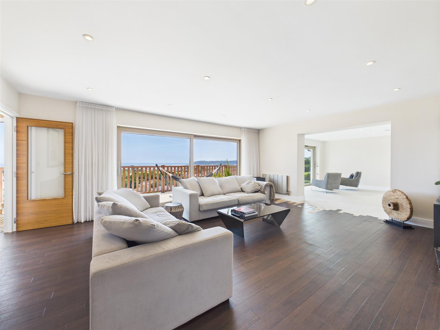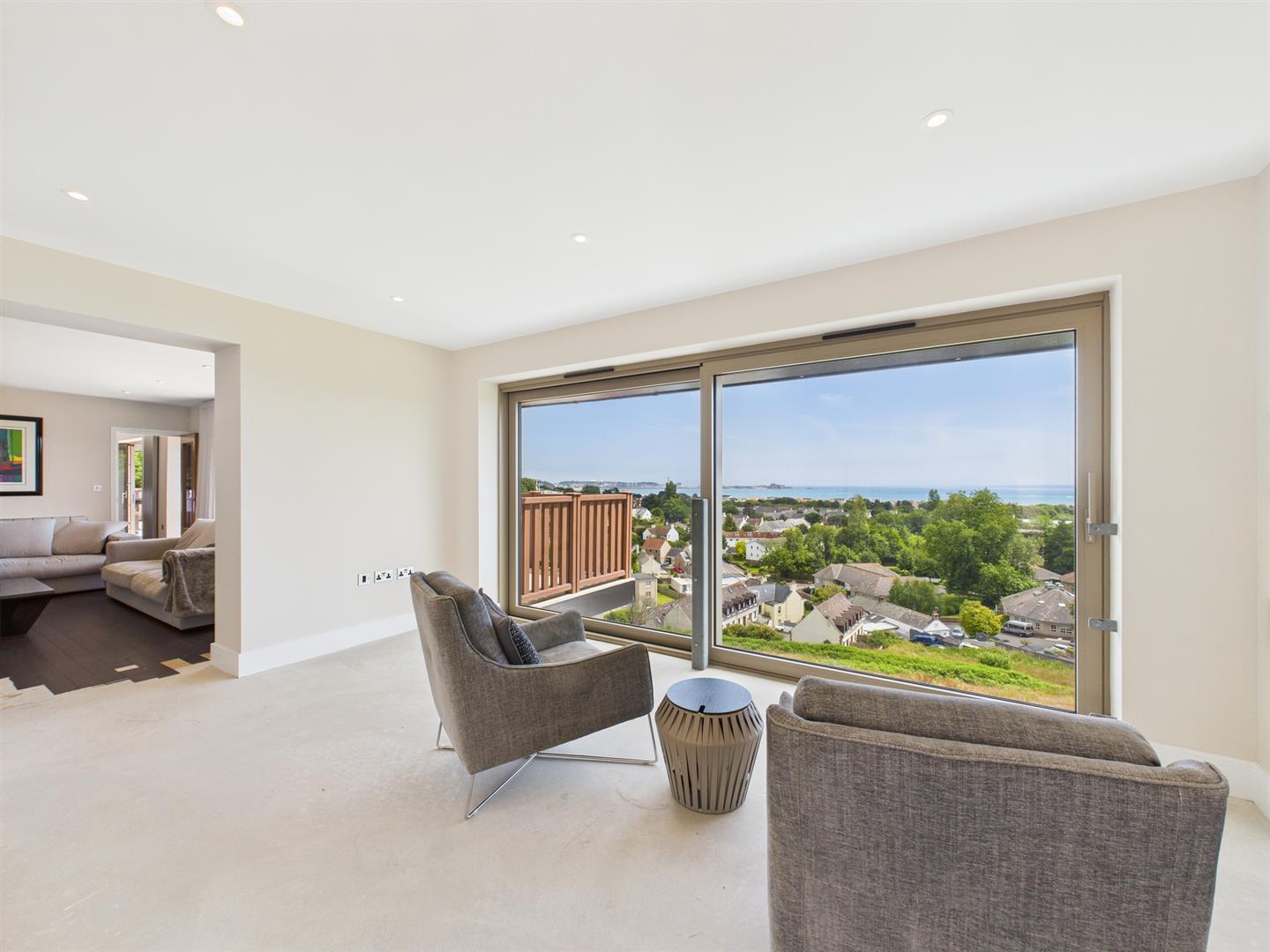 The accommodation is arranged over two levels. The ground floor features a stylish open-plan kitchen with sleek, modern finishes, seamlessly extending onto a spacious south-facing terrace—perfect for entertaining. There are also two reception rooms offering stunning views, along with the owner's suite and integral garaging.