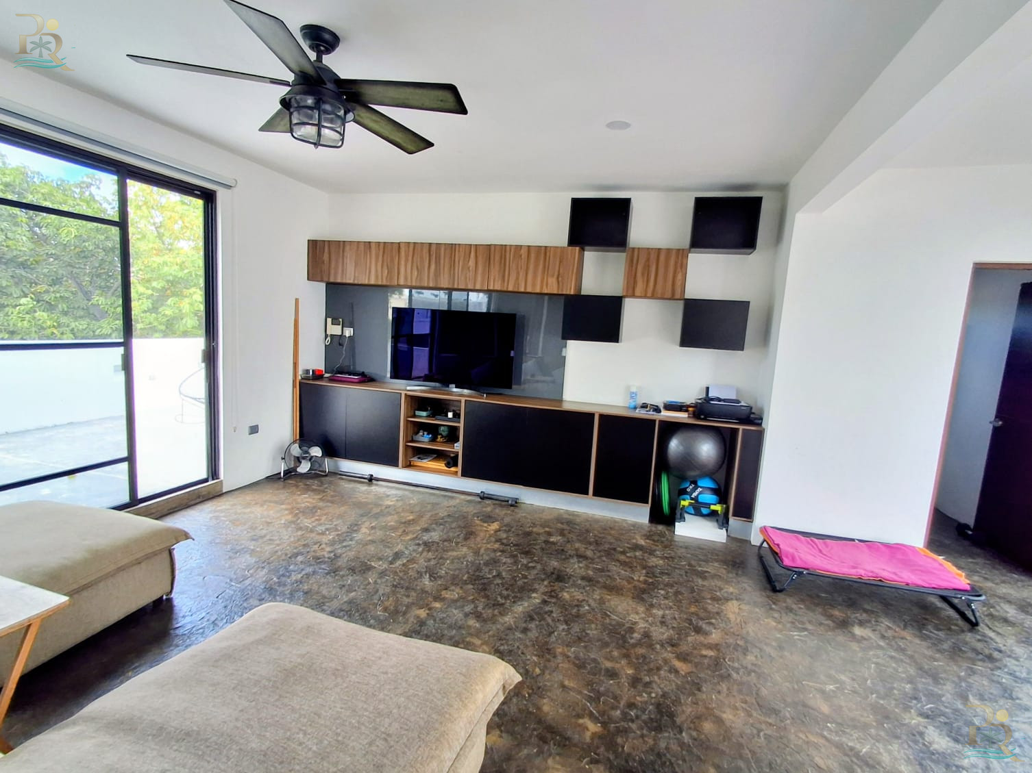 Enjoy multiple conveniences, including a TV room, laundry room, service quarters with a full bathroom, two covered parking spaces, side service corridors, and a spacious storage area.