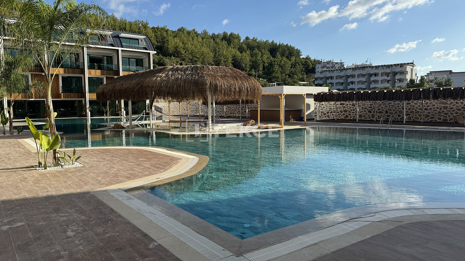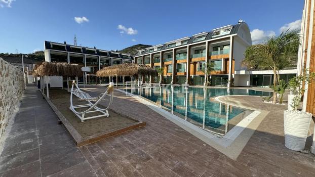 The stylish real estate is located in a luxury complex opposite the sea. The complex has a semi-indoor swimming pool, communal swimming pool, outdoor parking lot, sauna, fitness, indoor and outdoor children and adult playground, relaxation room, study room, library, tropical sand island, jacuzzi, cafe, lobby, pool bar, mini golf, 24/7 security camera system, and wifi in the social area.