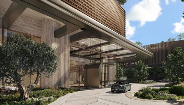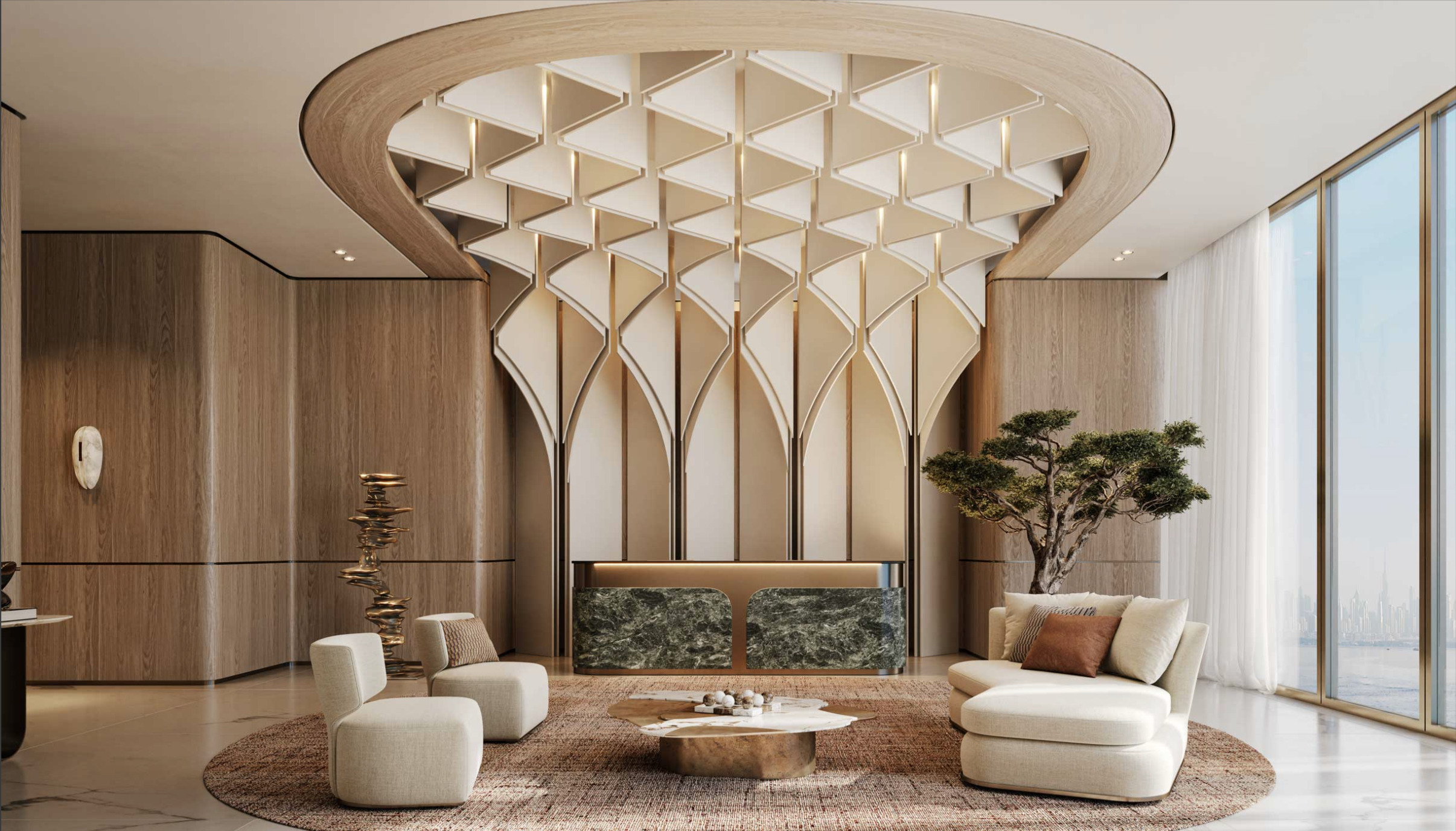 - Elegant lobby – Grand entrance with premium stone and bronze finishes