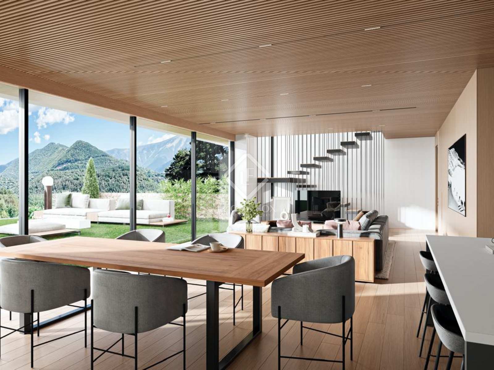This 582 m² townhouse has a modern design with natural materials such as wood, decoration in neutral tones, such as beige and gray, and great finishes. Likewise, it has large floor windows that allow abundant natural light to enter the main rooms and offer beautiful views of the mountainous and wooded environment and the garden.