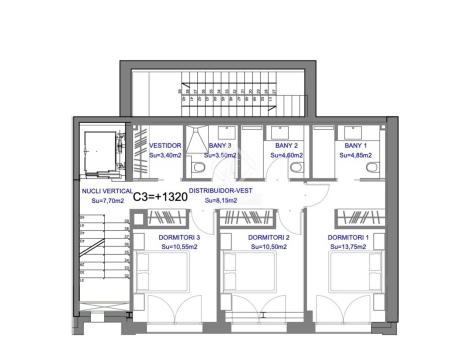 On the first floor we find the night area that houses two bedrooms, two bathrooms, a dressing room for the whole family and a third bedroom with its private bathroom.