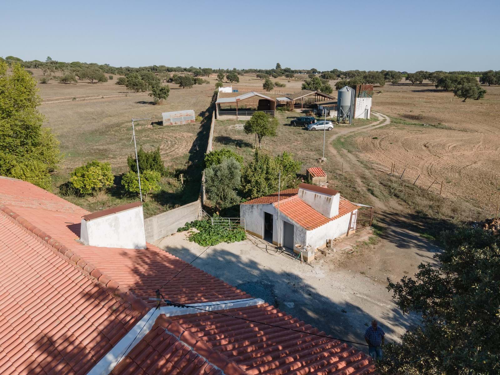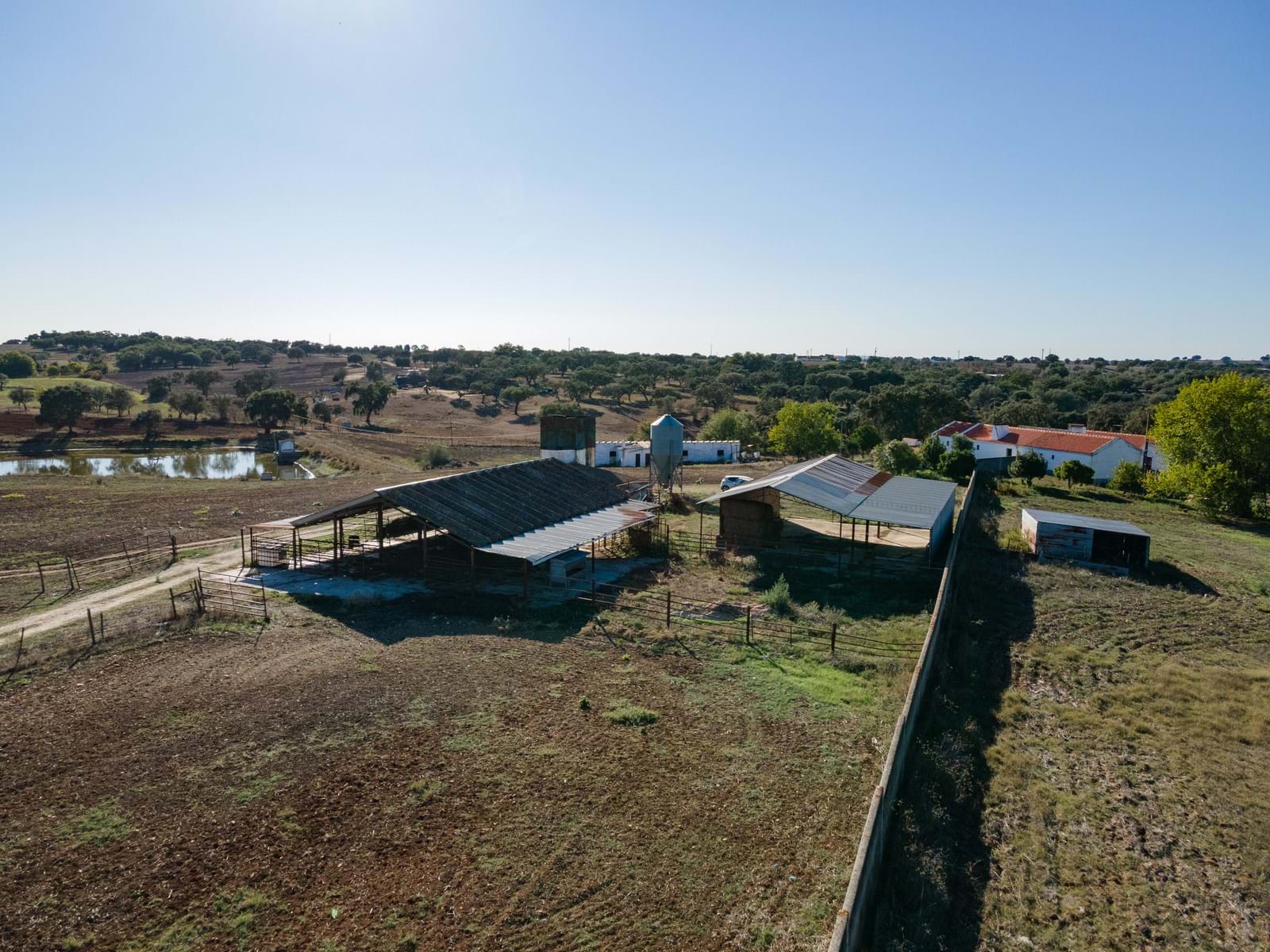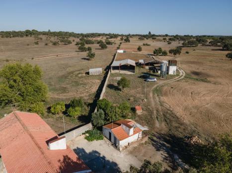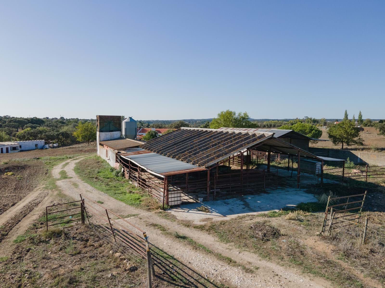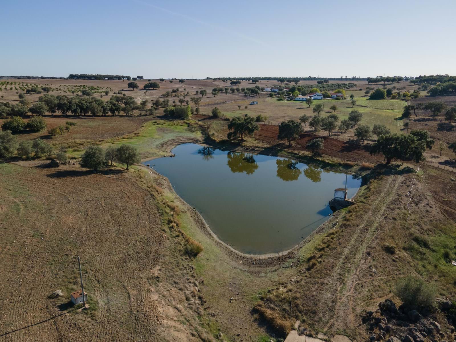 The small dam, which feeds the Ribeira de São Cristóvão, and the two boreholes guarantee water resources. The land is cultivated with pumpkins, wheat, barley, melon and watermelon, while olive trees and cork oaks add charm to the property. It also has a 20,000-liter tank, a silo, and structures for pig farming and cattle and horses.