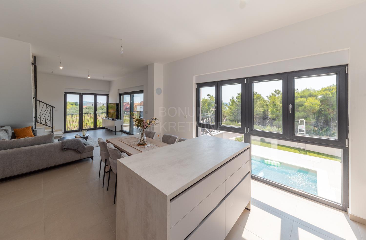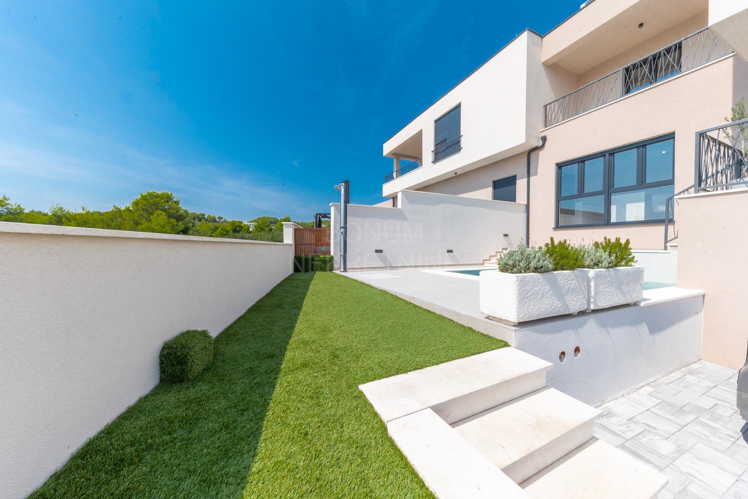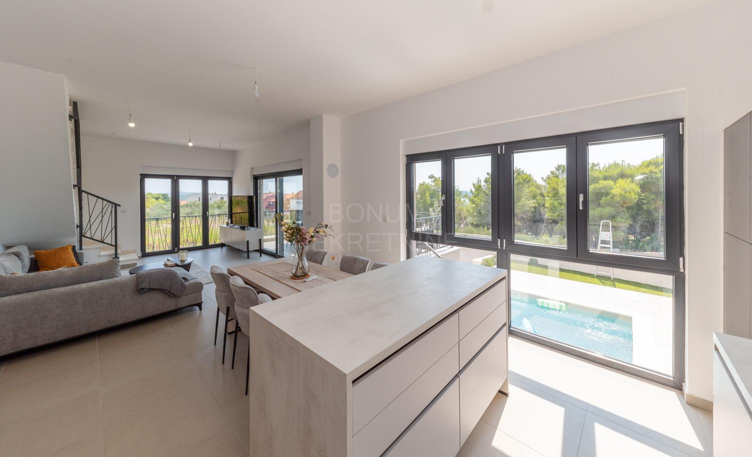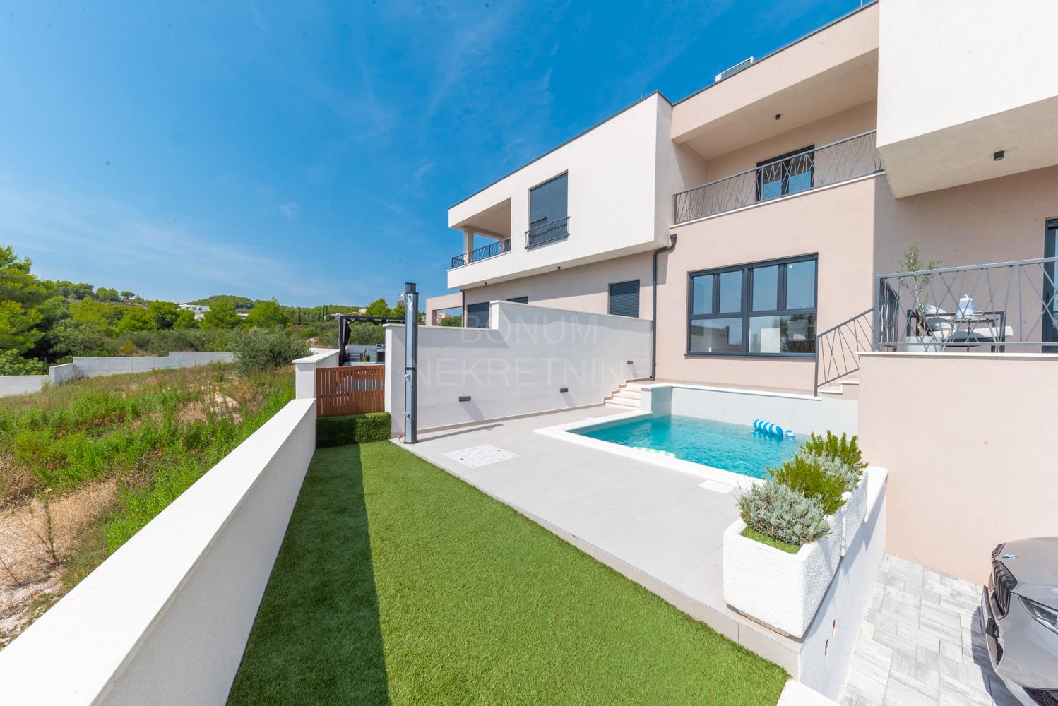 A superb modern house for sale with a private pool and a panoramic view of the sea, located in an ideal location in Vodice, just a few minutes' walk from the beach and the city center.