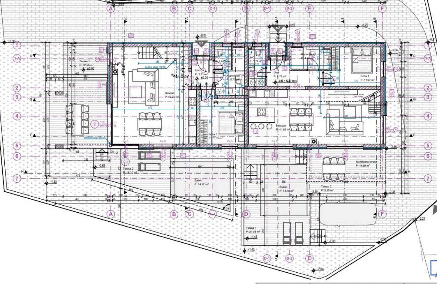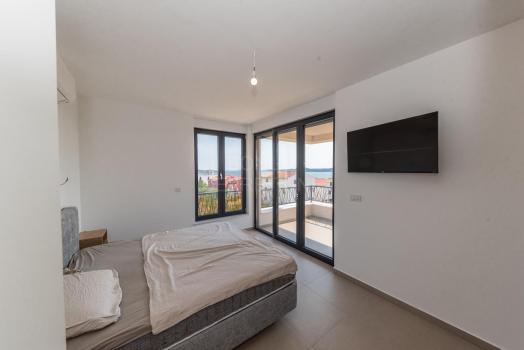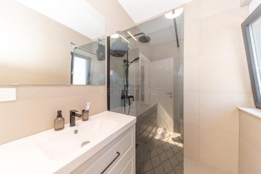 The ground floor of the house has a separate entrance with a security door, and inside it there is a spacious open space living room with a dining room, which offers a beautiful view of the sea. On this floor there is also a modern kitchen, toilet, bathroom and one bedroom. The living room and dining room have direct access to two terraces with a view to the south and a swimming pool of 13.78 m².