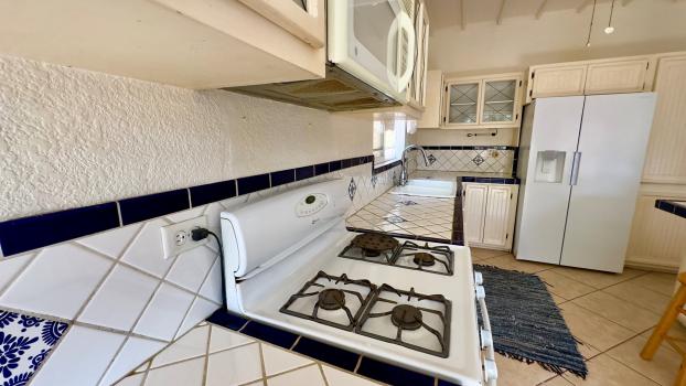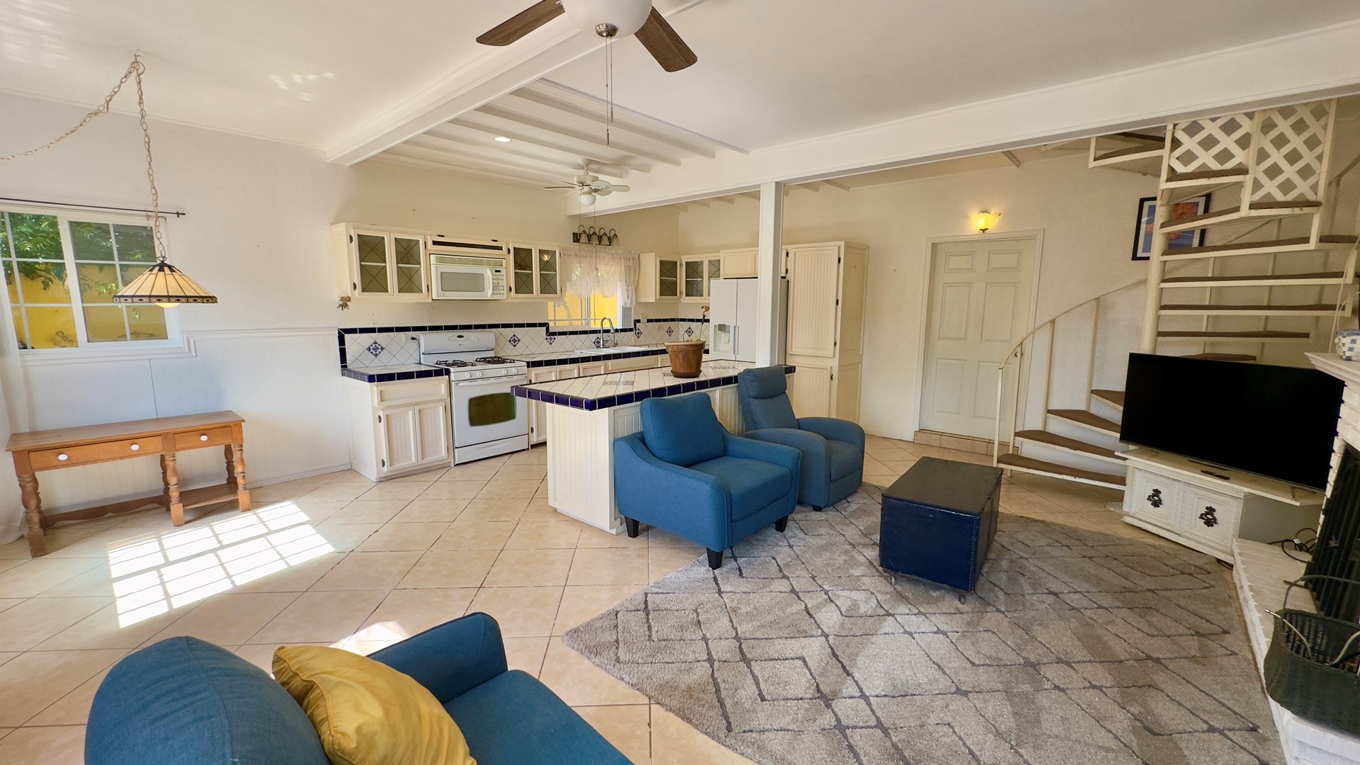 – Kitchen: Includes a microwave, stove, and refrigerator.