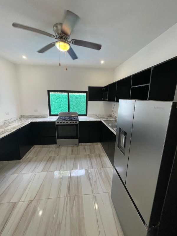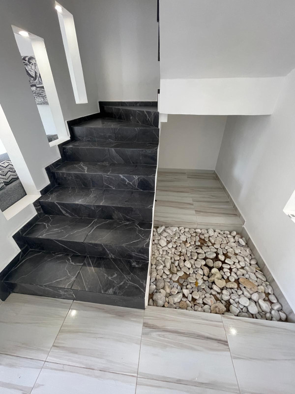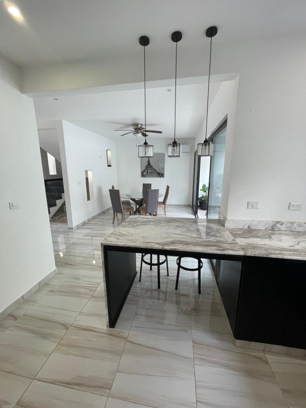 - Spacious kitchen with a stunning waterfall-shaped marble rack, providing an ambiance of luxury and sophistication.