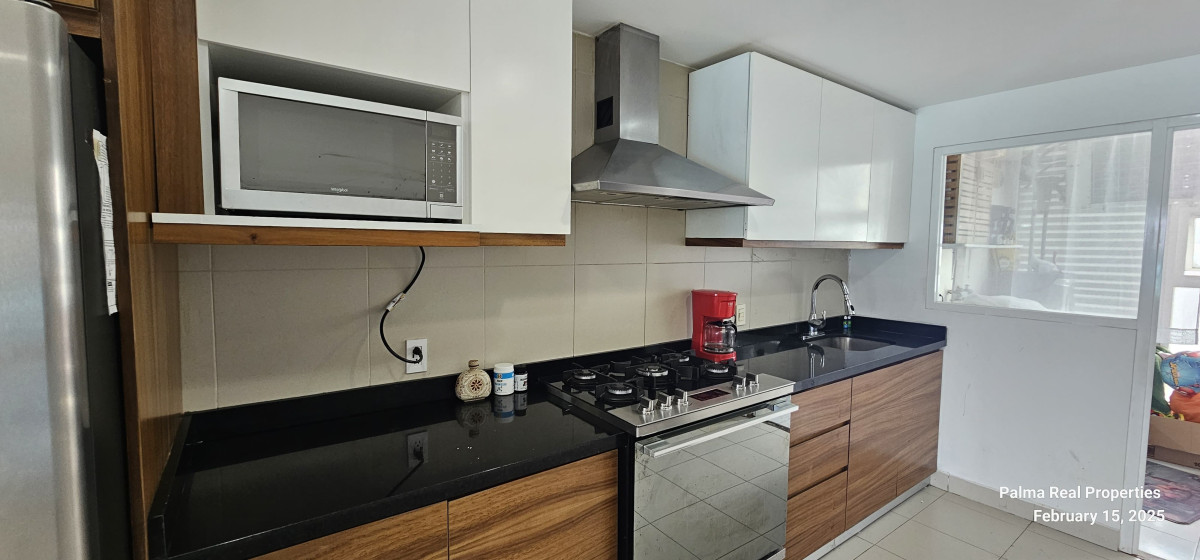 - The modern and functional kitchen is accompanied by a service area with space for a washing machine and dryer.