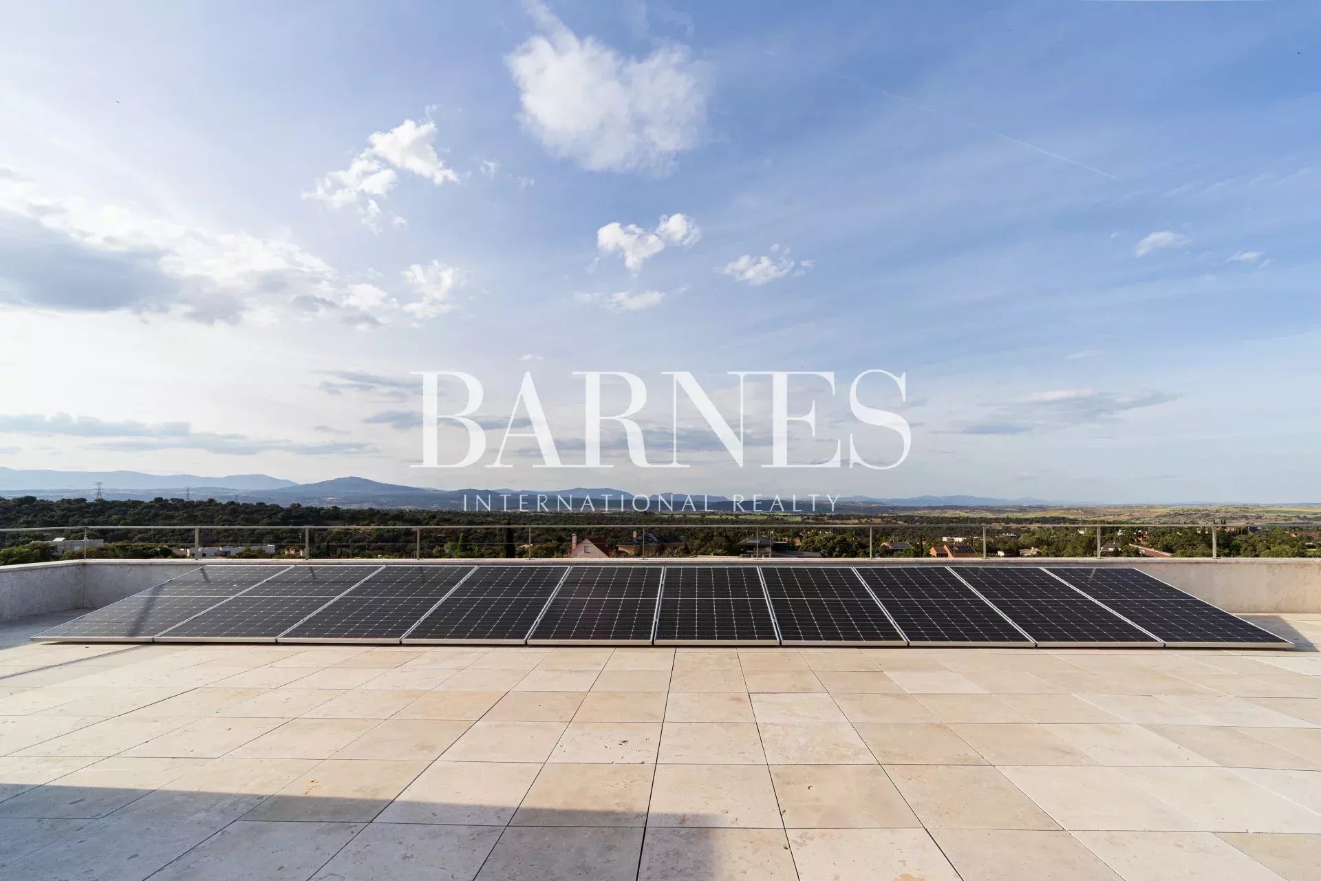The top floor includes a solarium with photovoltaic panels, contributing to the property’s energy efficiency.