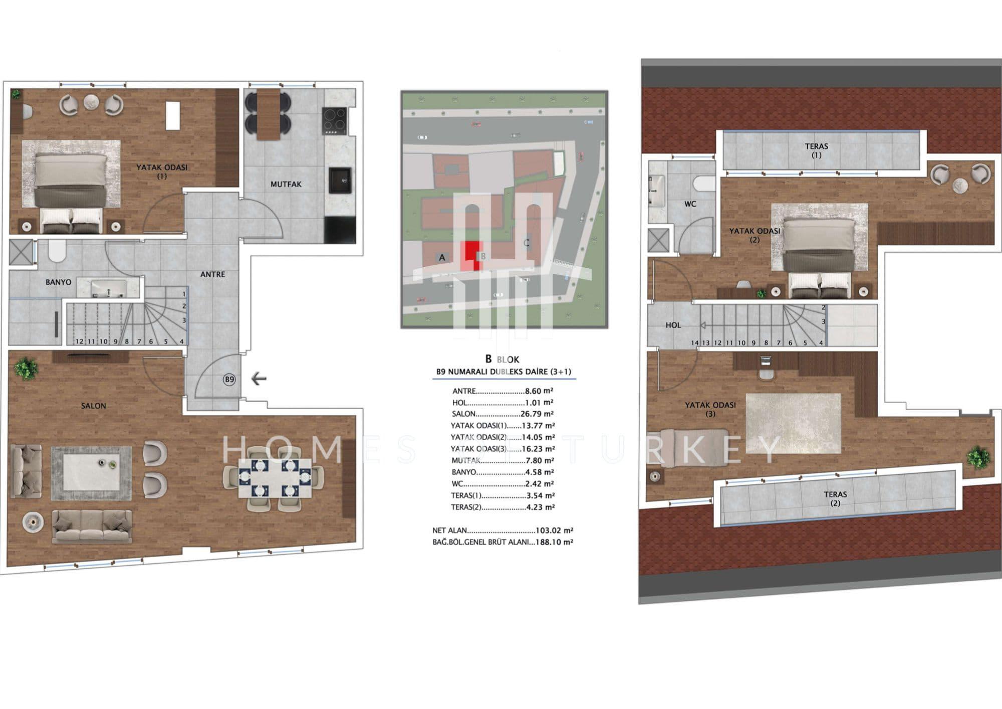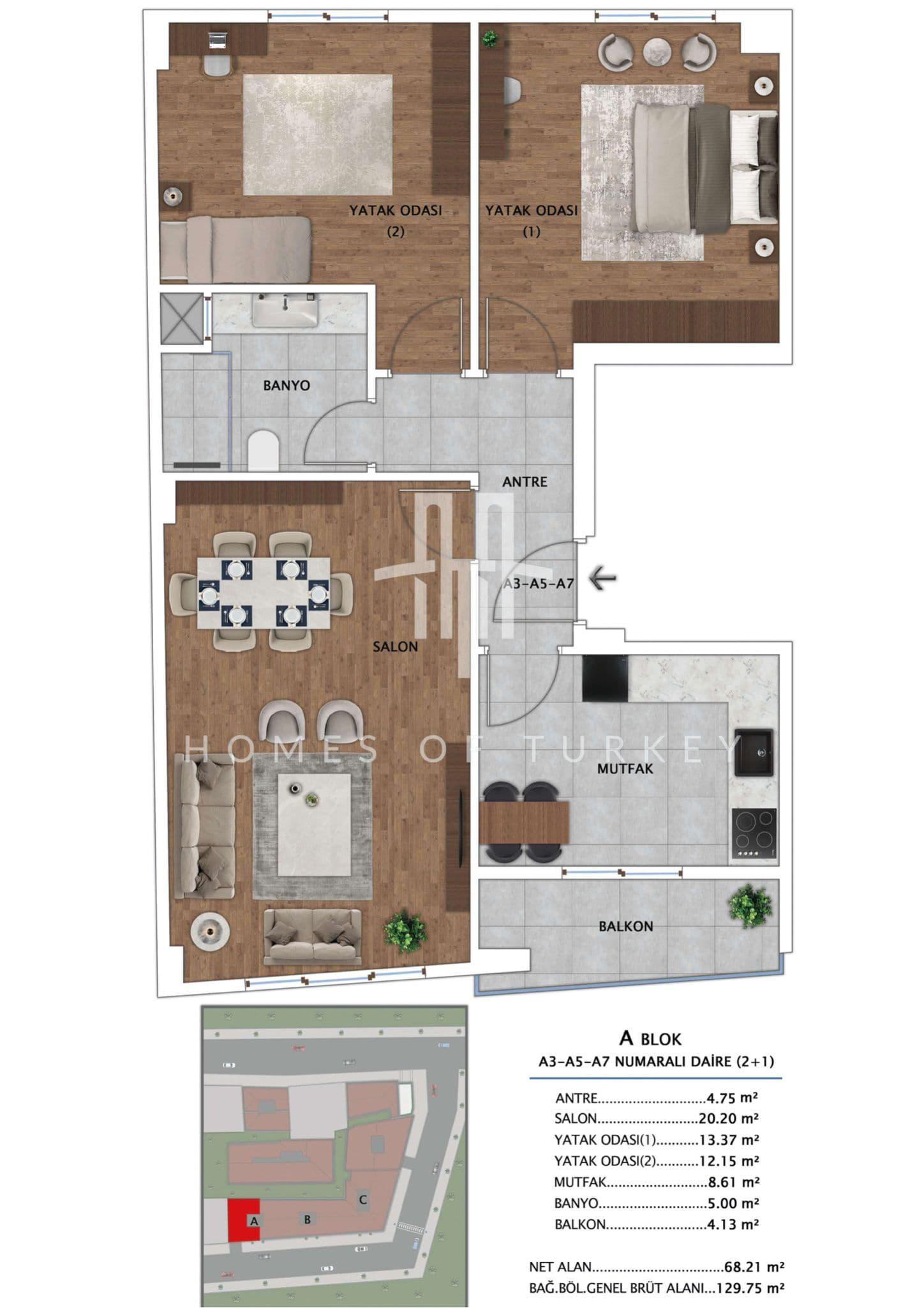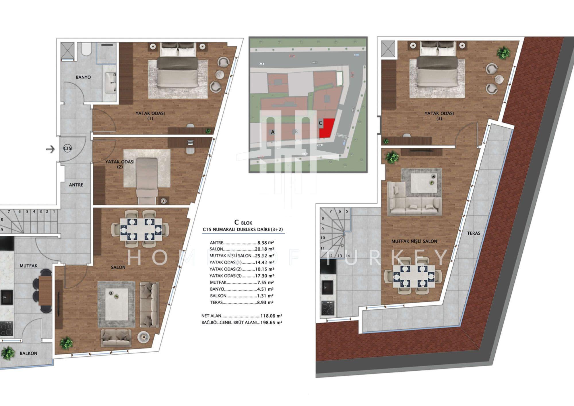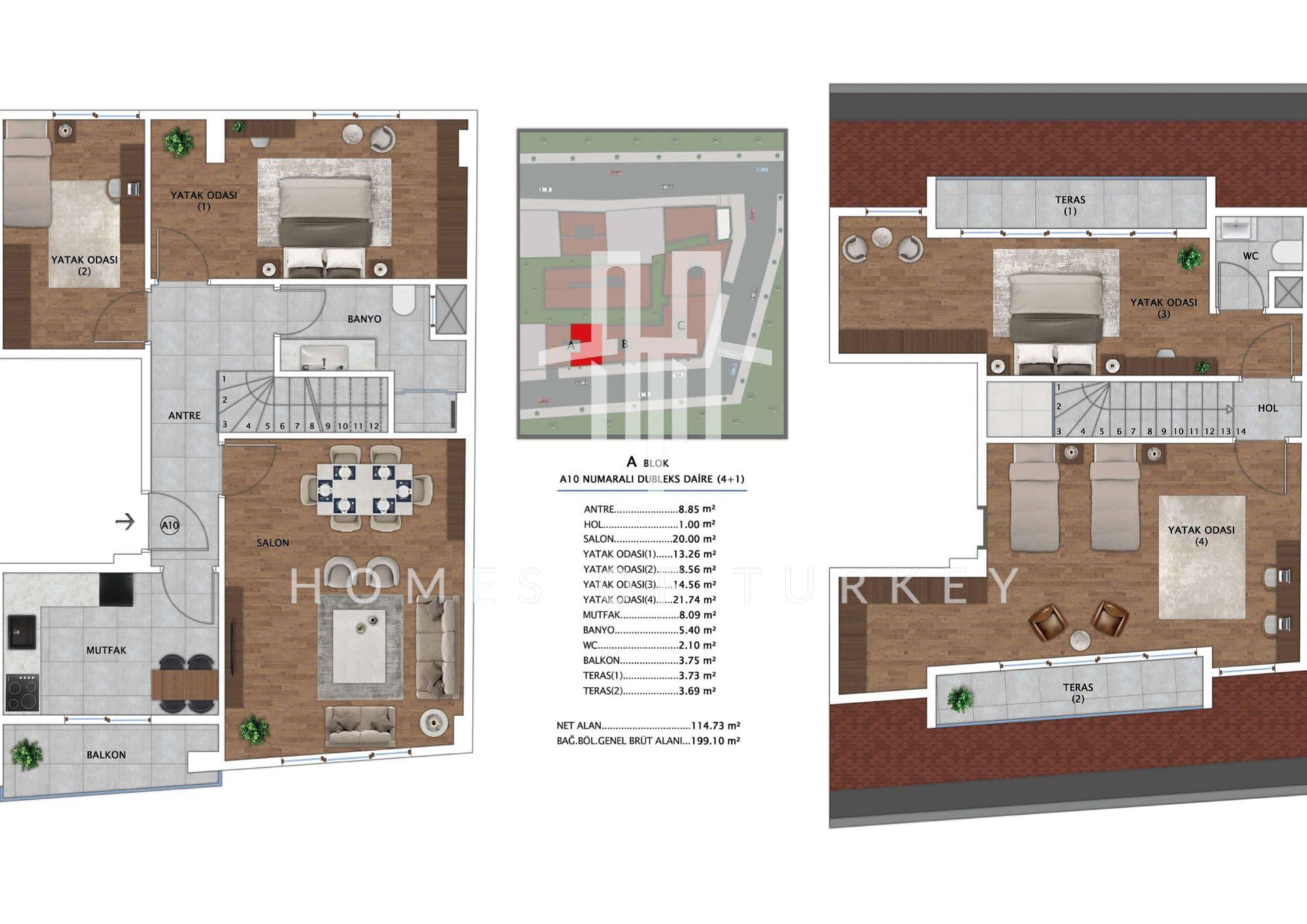 The project consists of 5 blocks and 89 independent sections on an area of 1.696 m². Flat types are; From 115 m² to 203 m², 2+1, 3+1, 3+2 and 4+1 flat options are offered. In the luxury project, there are social facilities such as indoor parking, security camera, 24/7 security service, elevator, well-kept garden, children's playground.