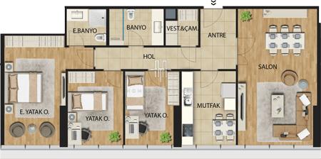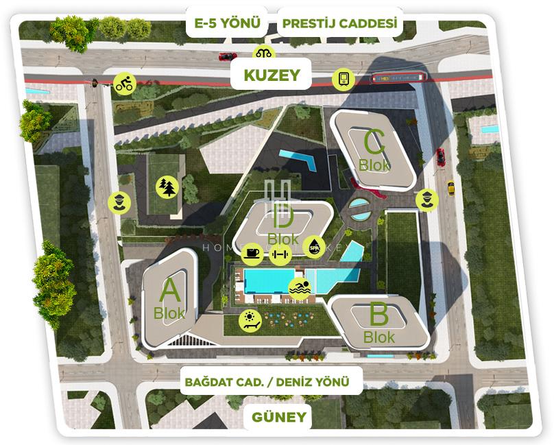 The project is built on a land of 16 thousand square meters and consists of 4 towers, three of which are 23 and one of which is 22 floors, and includes 830 luxury residences and 20 commercial units. There are 526 1+1 flats, 261 2+1 flats and 43 3+1 flat types. There are many luxury features in the site such as indoor and outdoor parking, indoor and outdoor swimming pool, well-kept garden, steam room, relaxation room, sauna, spa, walking paths, children's pool, security, service services, concierge.