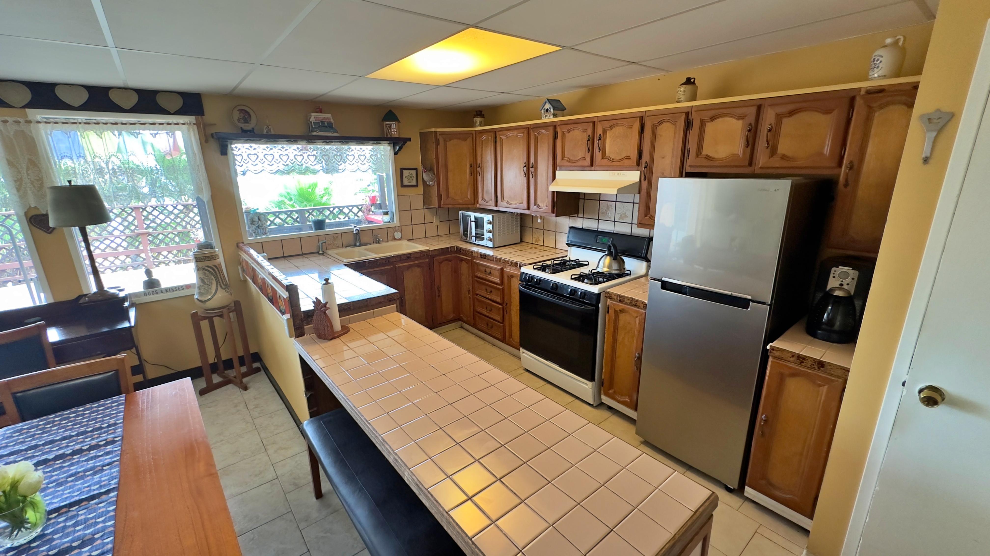 Kitchen: Fully equipped kitchen featuring a stove and oven, fridge,