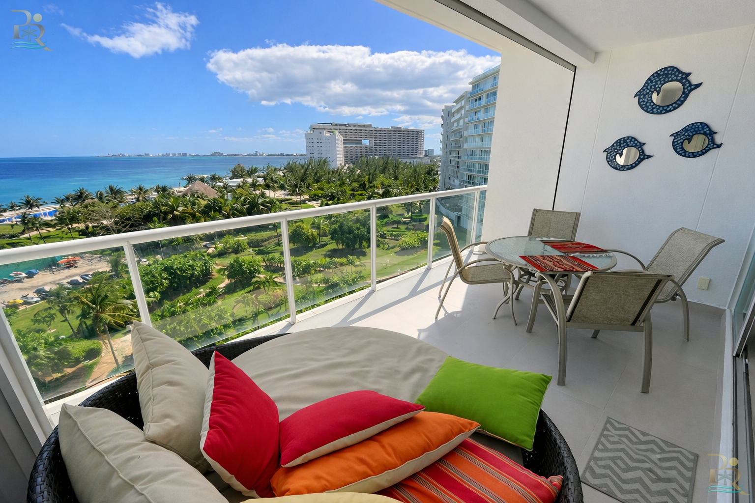 The Crown Jewel: A massive 6th-floor lounge terrace. Ready for a circular daybed and outdoor dining, it offers panoramic views stretching from the Isla Mujeres horizon to the Cancun Hotel Zone.