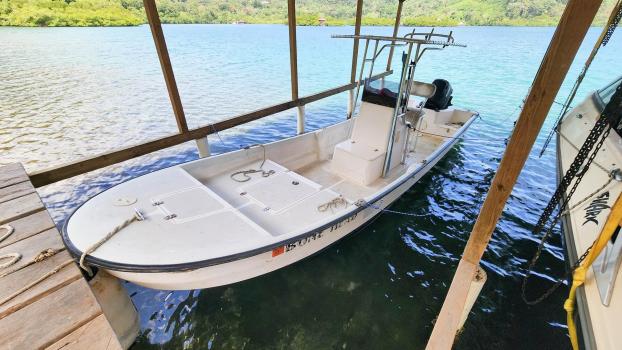 The massive Rancho, has a vaulted thatch roof, skillfully crafted in a traditional way without twine. The space is the ideal hang out zone, with a fridge and minibar, day beds and patio furniture. It too has a covered deck, cantilevered near the edge of the island, for undisrupted views to the South. From the rancho there is a new staircase which leads to an almost finished look out point, the highest structure of the island will have 360 views of Aguacate bay when completed. Out the back of the Rancho is a concrete pad for the hot tub ( present but yet to be installed) and a pathway to the private cabana on the far side of the island. That path leads all the way around the island and gives access to the over the water boat house, storage space and workshop. Lots of goodies to be found in there, and many that will stay with the island… most noteably BONE HEAD the boat.