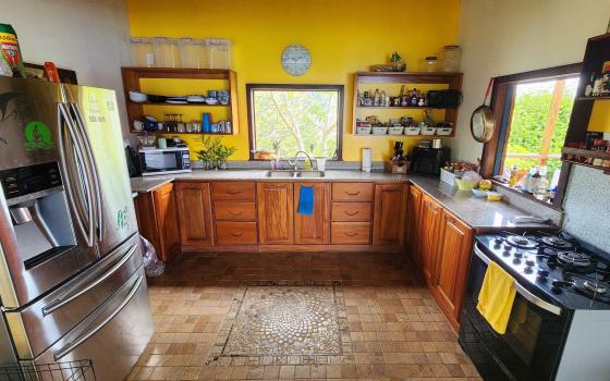Sharing a roof with the bed/bath/lounge/office building, and divided by a pass through, is the open air kitchen, and a second bathroom and outdoor shower. A path from the kitchen to a massive open air rancho leads past a beautiful rock garden, decorated with orchids and a small fish pond, a lovely center piece of the island which divides the spaces in a very ZEN way.