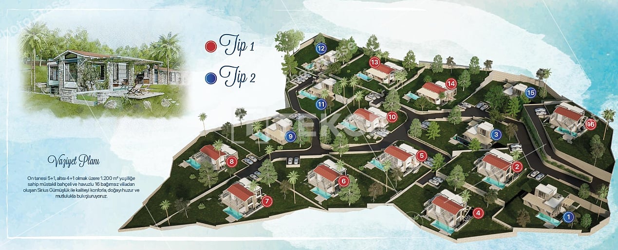 The award-winning project is built on a total land area of 20,120 m² and features 16 detached villas, each with private pools and gardens, along with 1,200 m² of green areas. Ten of the villas have 5 bedrooms, while six are 4-bedroom units. The project includes 2-story 5-bedroom and 3-story 4-bedroom villa types. Each villa has spacious living rooms, high ceilings, underfloor heating, electric shutters, a private pool, a private garden, and a parking area. Natural stone façades and high wooden gable roofs add unique character to the architecture. With partial sea and nature views, these villas offer a peaceful and comfortable life all year round.