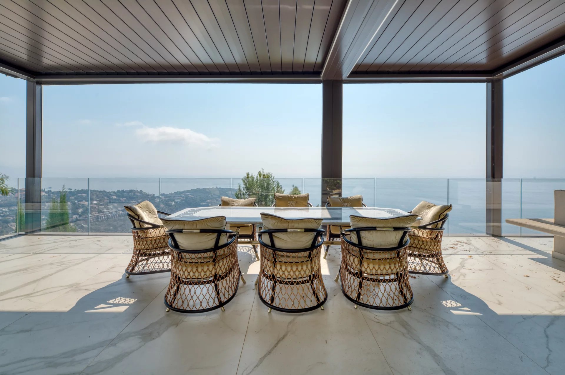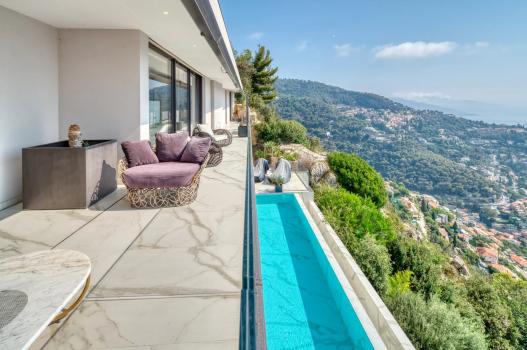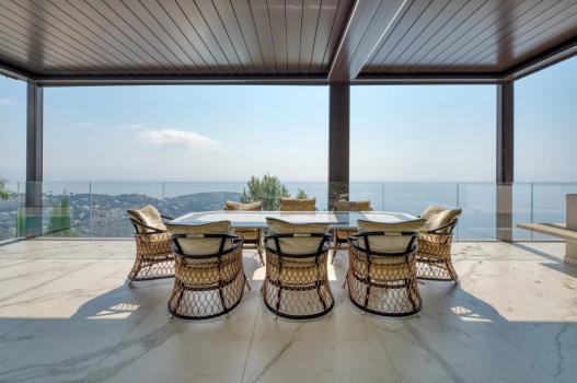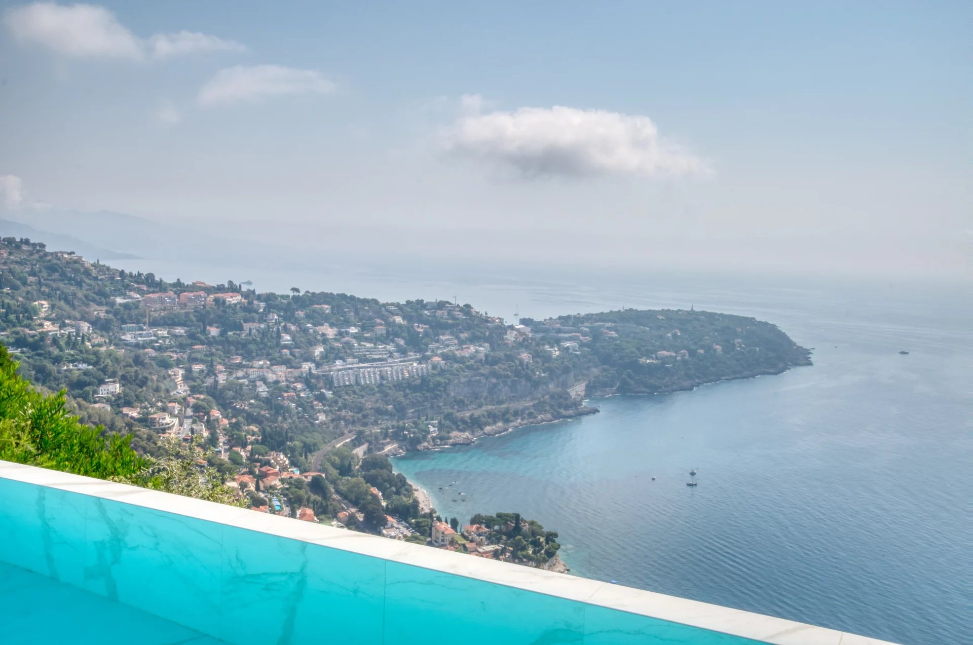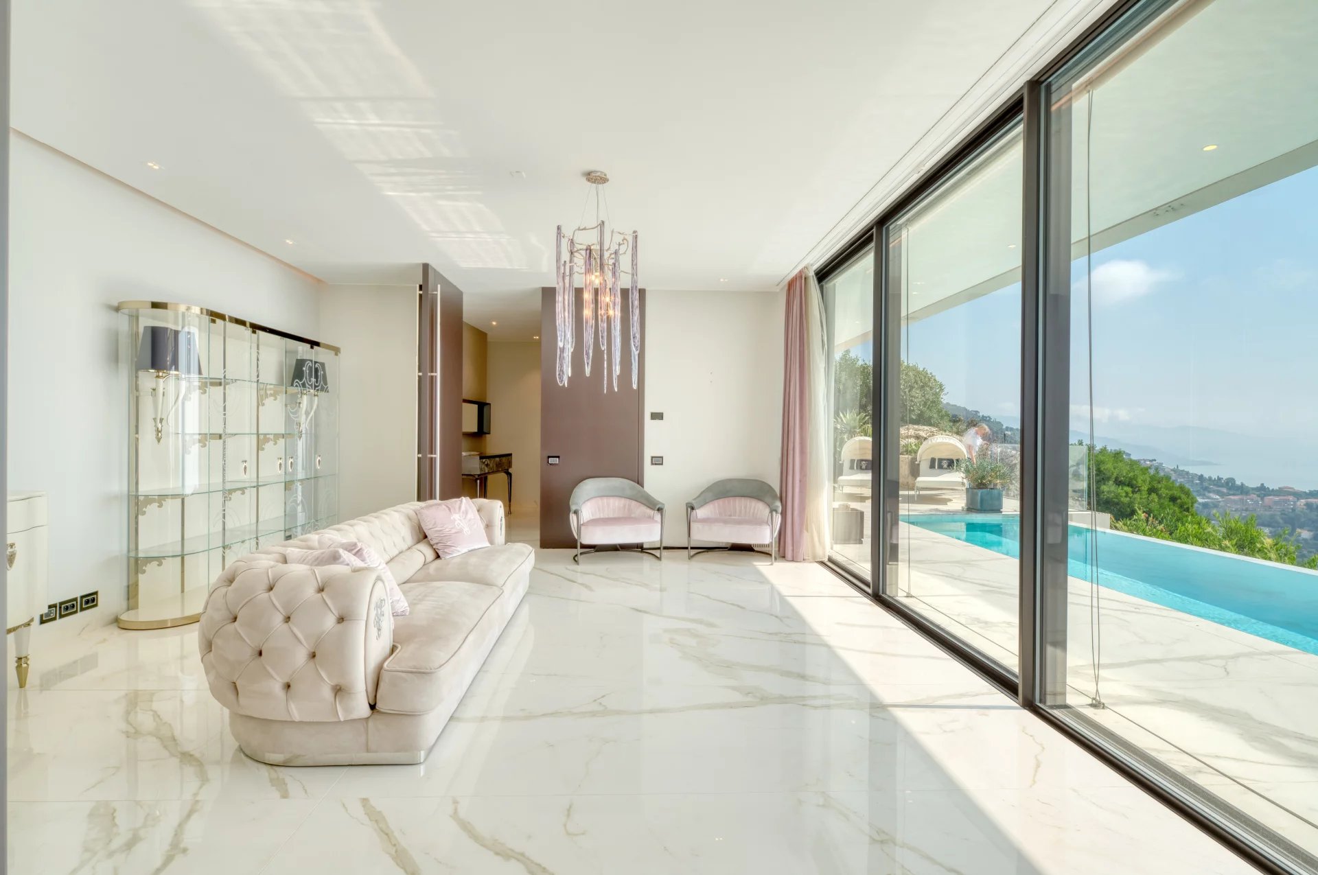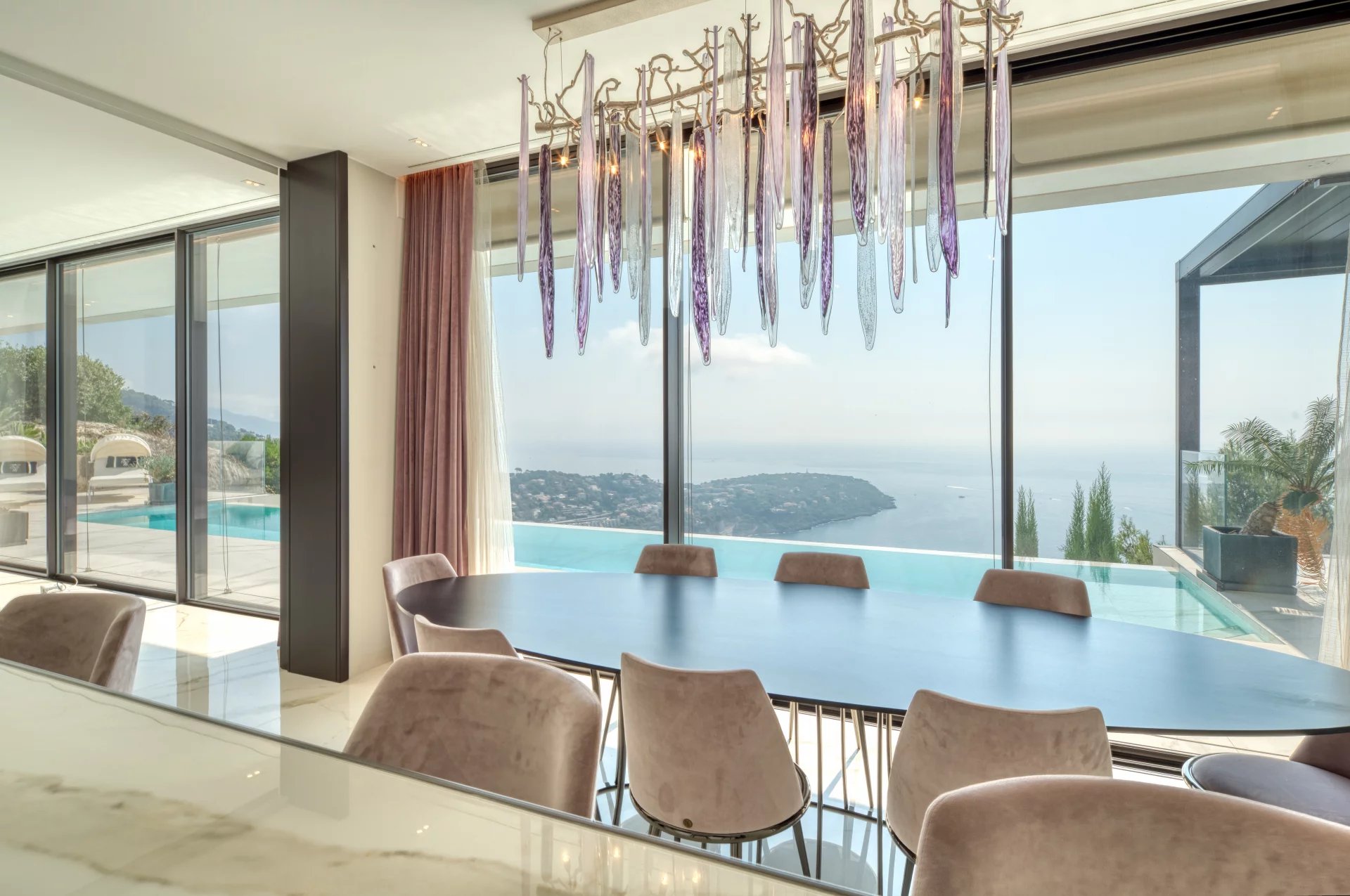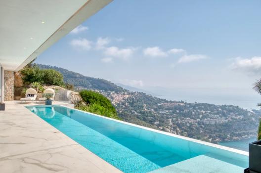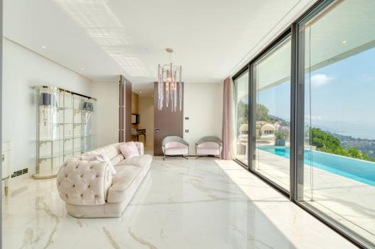 ROQUEBRUNE-CAP-MARTIN, 5 minutes from Monaco, quiet, panoramic view 180°, sumptuous property of a living area of 570 m2 built on landscaped land of 3,780 m2, large garage, parking and heated infinity pool. The villa with contemporary style and large windows, with high-end finishes is on 3 levels easily accessible by elevator. It consists of 7 bedrooms all en suite and 8 bathrooms, with many relaxation areas, gym, jacuzzi, sauna, hammam.