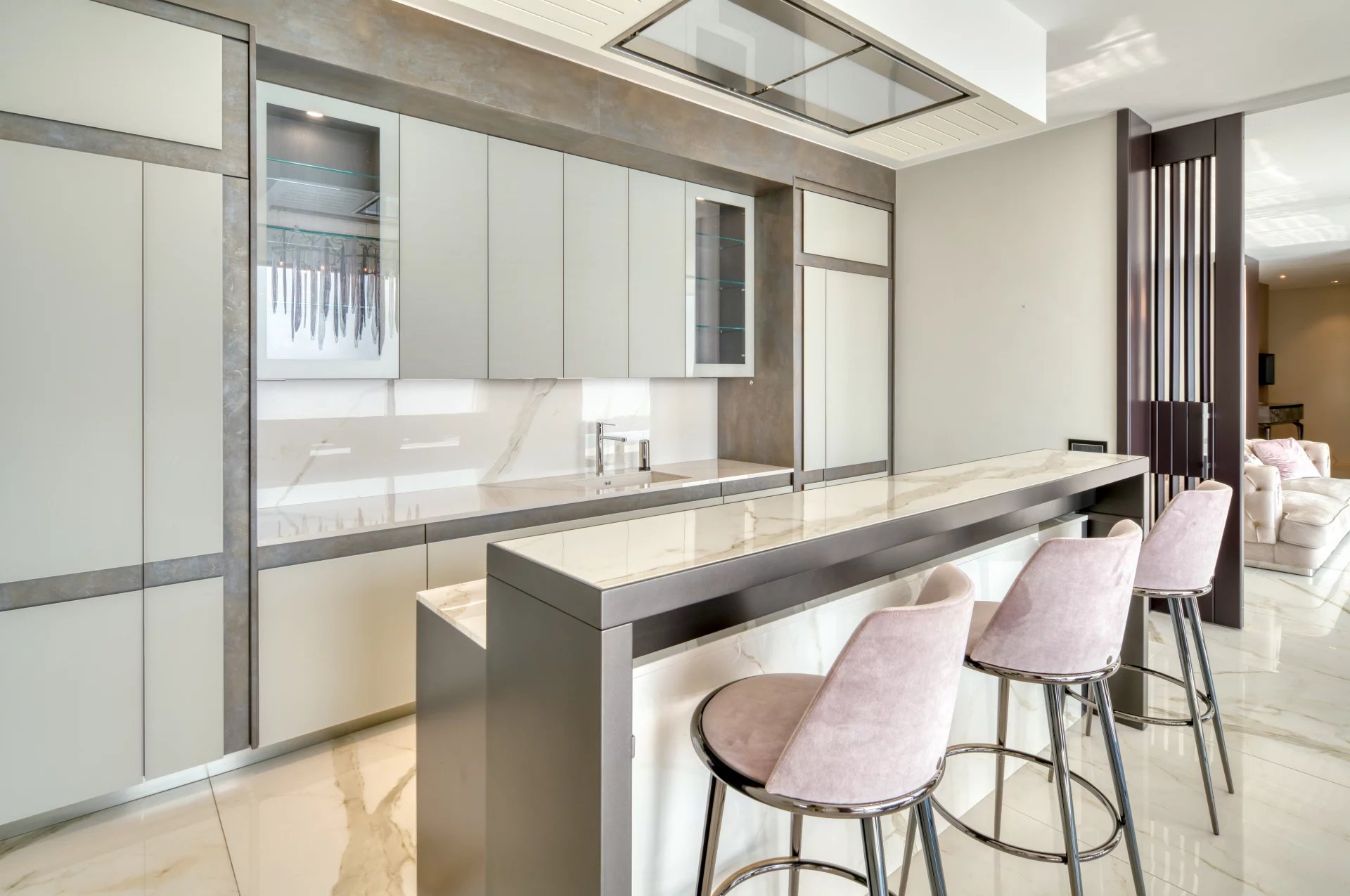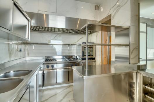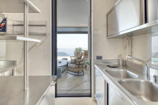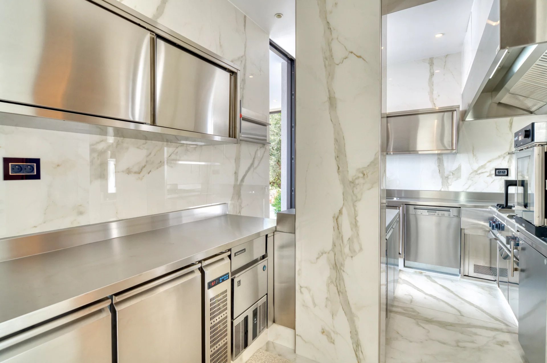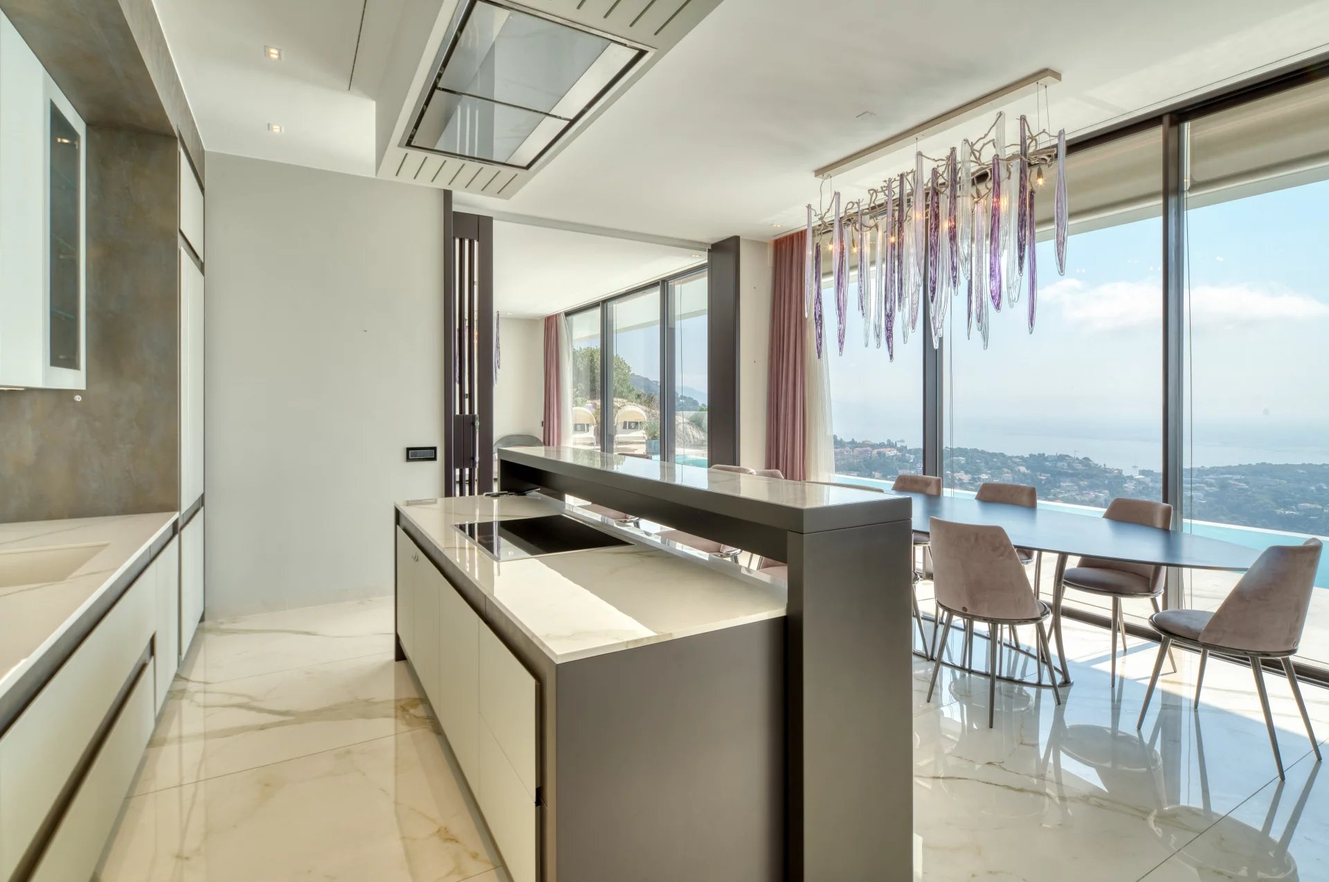 From the entrance, a large living space opens onto the outside thanks to the large windows. The living room, dining room and kitchen open directly onto the main terrace, where there is a heated infinity pool. A second professional kitchen allows to prepare meals in complete discretion.
