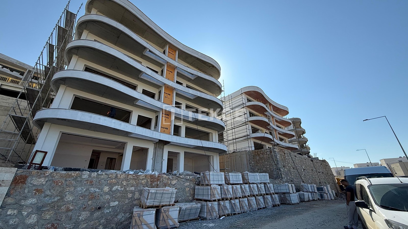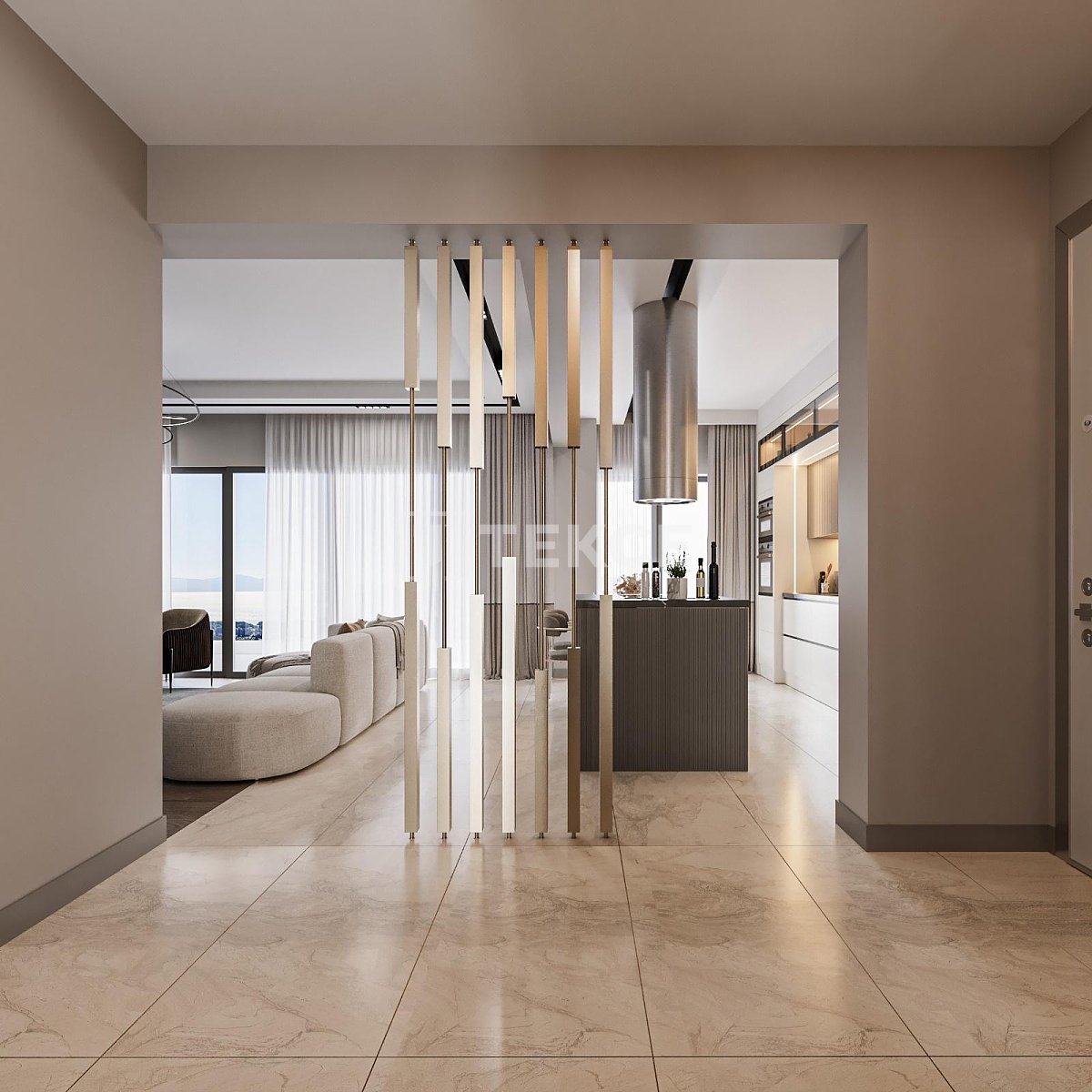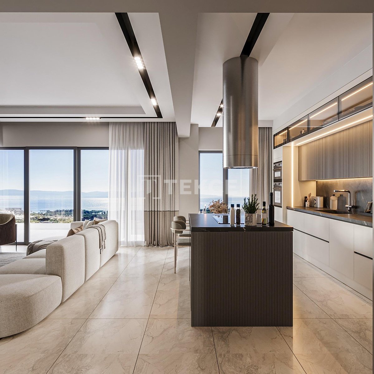 The apartments are designed with special thermal insulation, high-quality modern exterior cladding, and large balconies offering uninterrupted sea views. Inside, they feature a spacious living room, an open-plan kitchen, comfortable bedrooms, and an en-suite bathroom. Other interior details include ceramic flooring, a natural gas underfloor heating system, air conditioning infrastructure, premium kitchen cabinets, lacquered interior doors and bathroom cabinets, a built-in wardrobe, a high-quality steel entrance door, and large insulated aluminum-framed windows.
